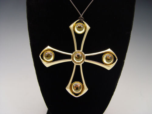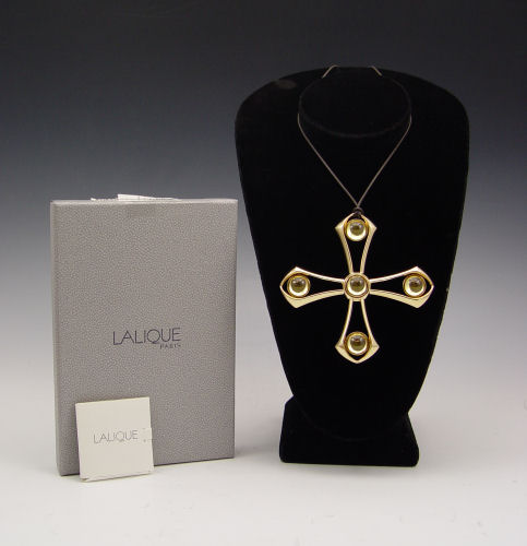 LALIQUE OCEANIA SOLEIL LARGE CROSS PENDANT: 18K gold plated with crystal cabochons. The cross is 4'' x 4''. Black cord. Made in France. New condition in the box.