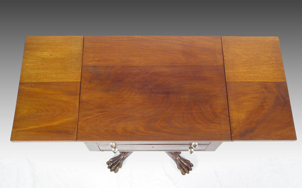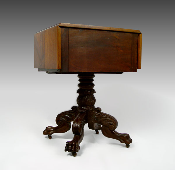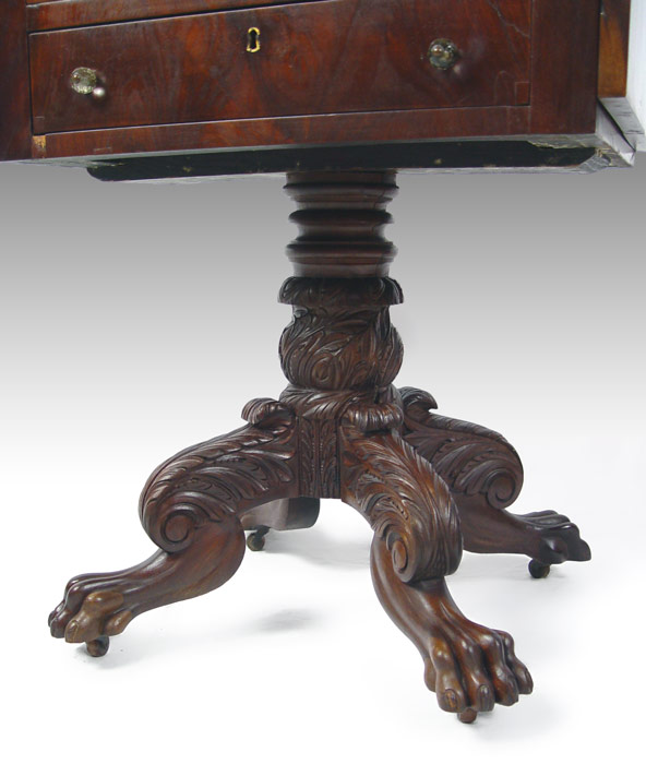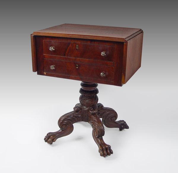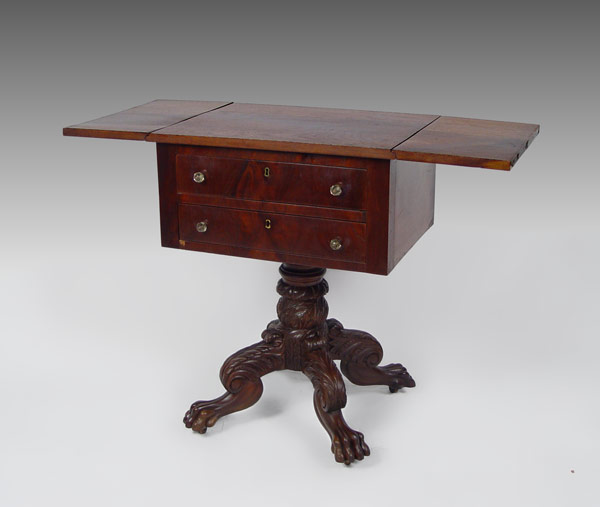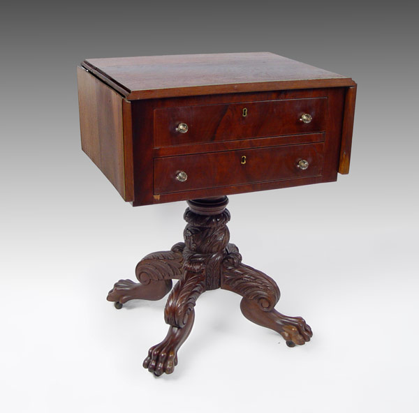 19TH CENTURY 2 DRAWER DROP LEAF WORK STAND: Mahogany with veneered drawer fronts and cut glass ball pulls. Heavy carved pedestal base with 4 carved legs with acanthus leaf design and lion paw foot on casters. 30'' h. x 24'' x 17 1/2''.