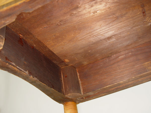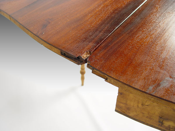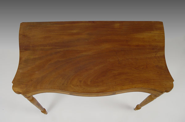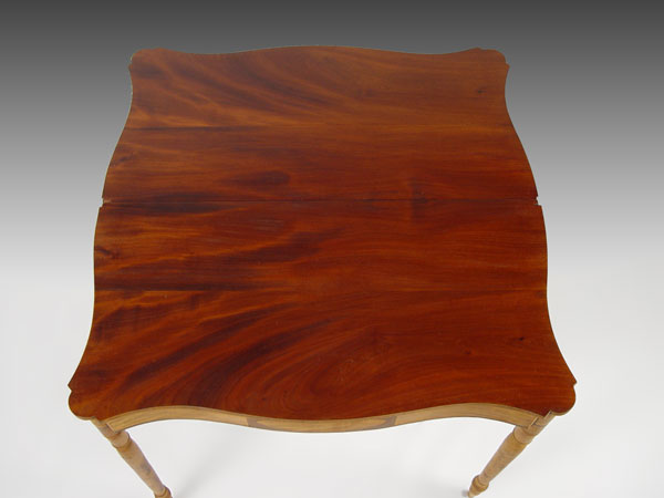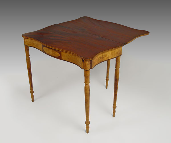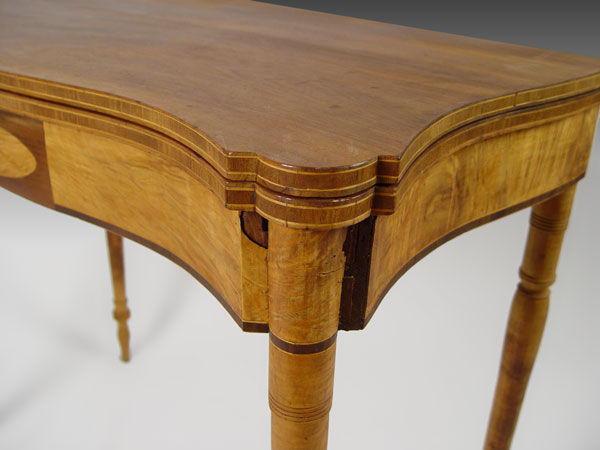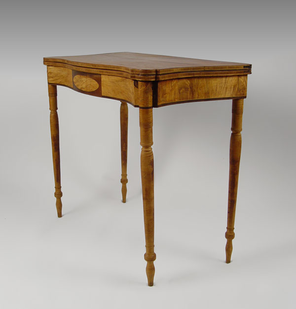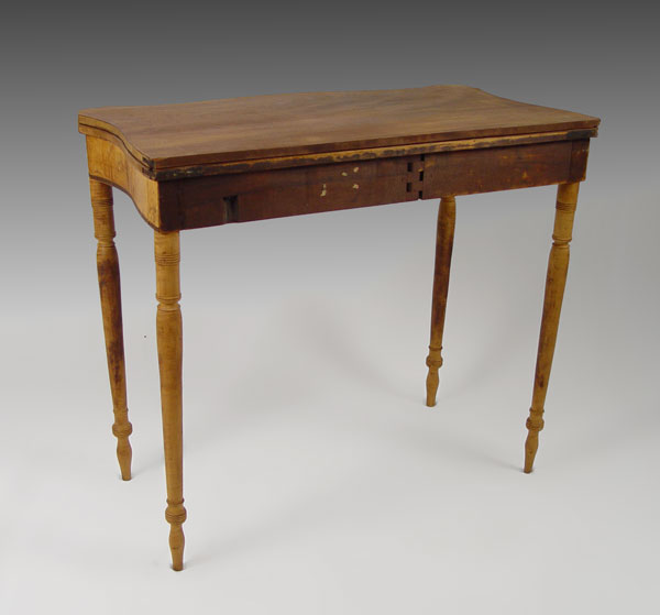 AMERICAN FEDERAL MAHOGANY AND FLAME BIRCH CARD TABLE: Possibly New Hampshire. Fine turned legs of flame birch, mahogany band inlay with block inlay design in front. Note: Needs restoration. Hinge hardware is missing, raw finish. 34'' wide, 17 ½'' deep, 29 ½'' tall.