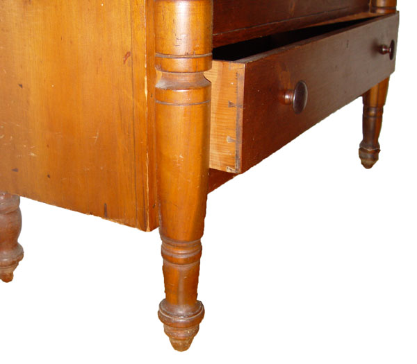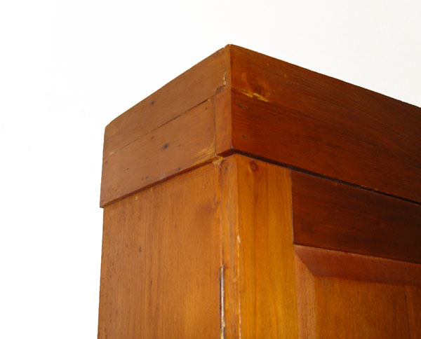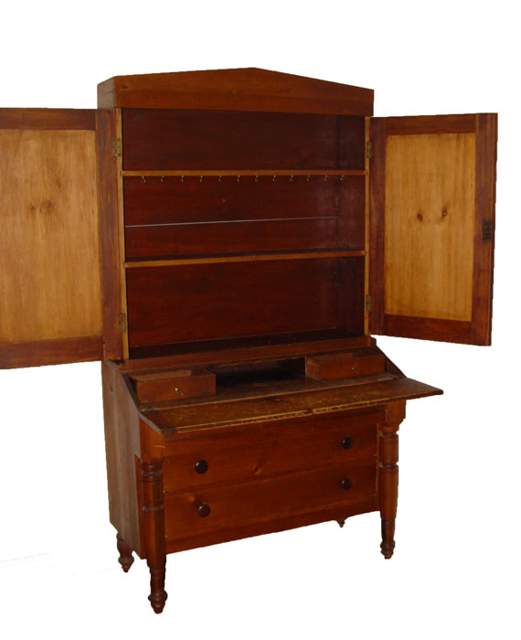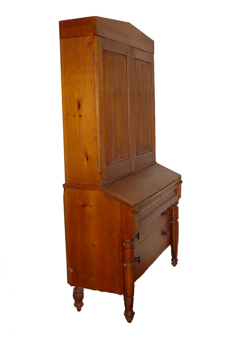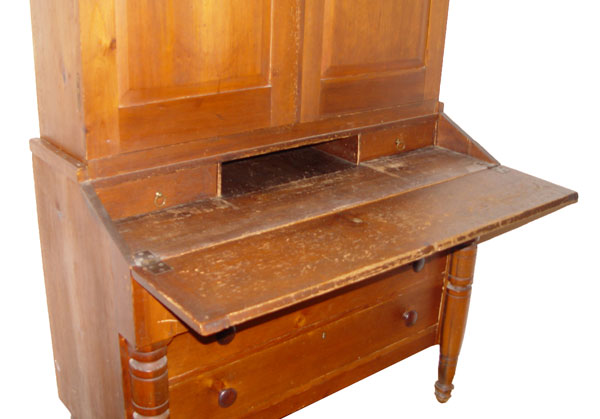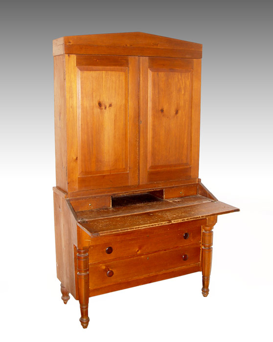 EARLY 19TH C AMERICAN COUNTRY PINE SECRETARY: 2 door blind front bookcase over fall front desk over 3 recessed drawers. Interior condition related to age and use. 76'' tall x 43'' x 19''.