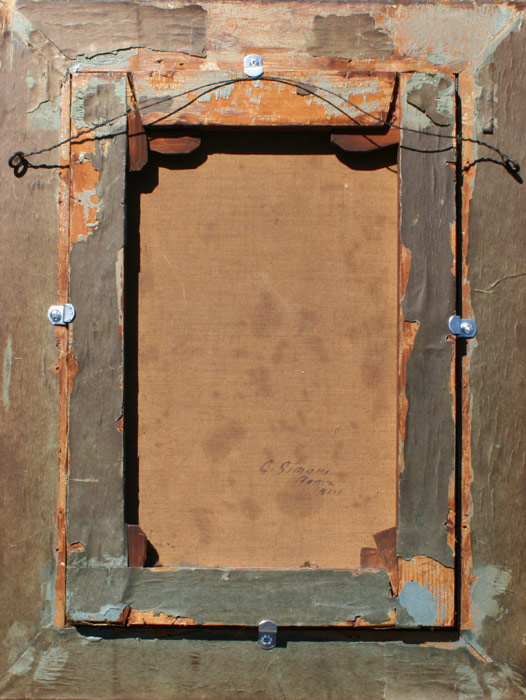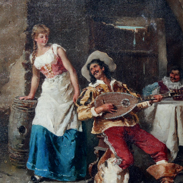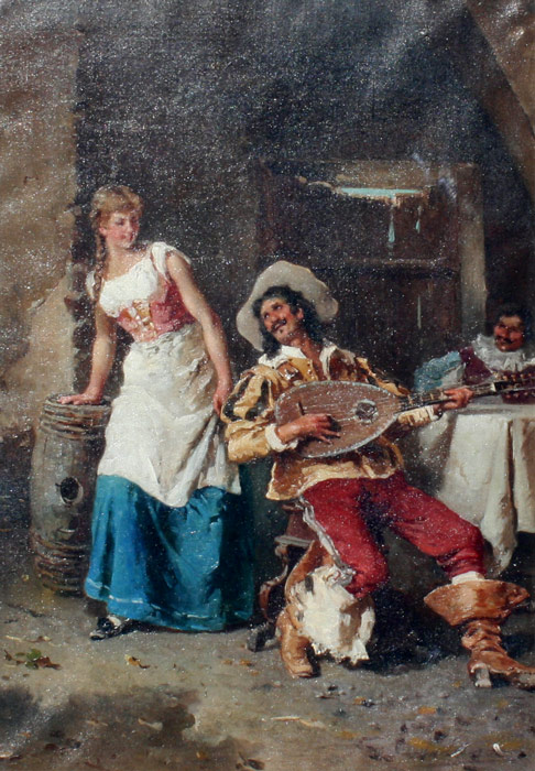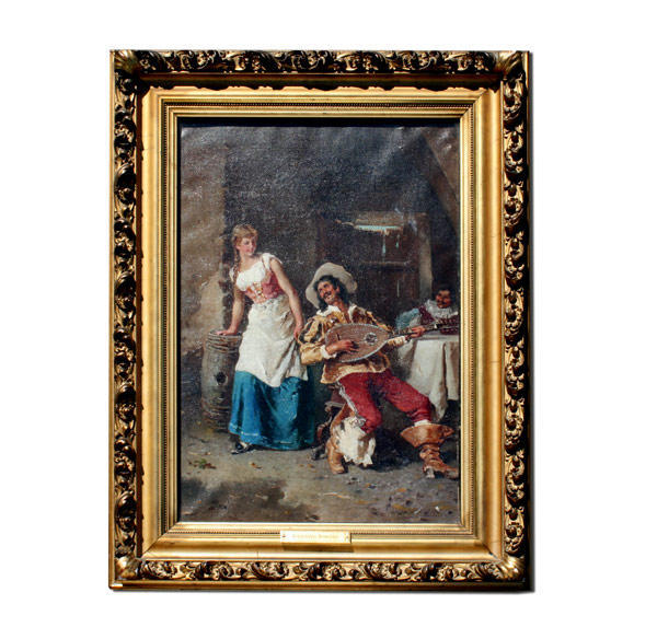 SIMONI, Gustavo, (Italian, 1846-1926): ''The Cavalier's Serenade'', Oil/Canvas, 15 1/2'' x 10 3/4'', monogrammed lower left, signed and dated verso, gilded gesso frame with wear, 20 1/2'' x 15 1/2''. Est. $3000/5000**