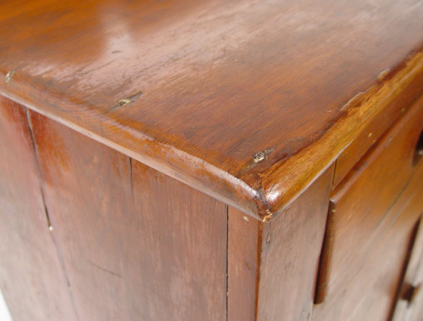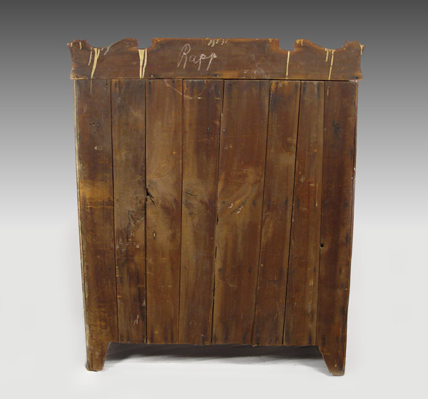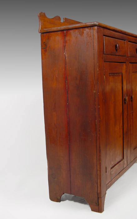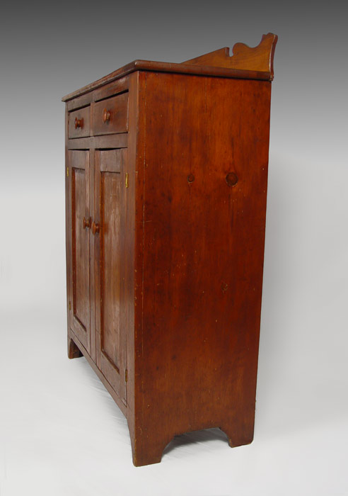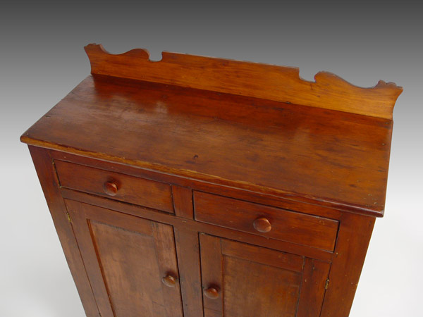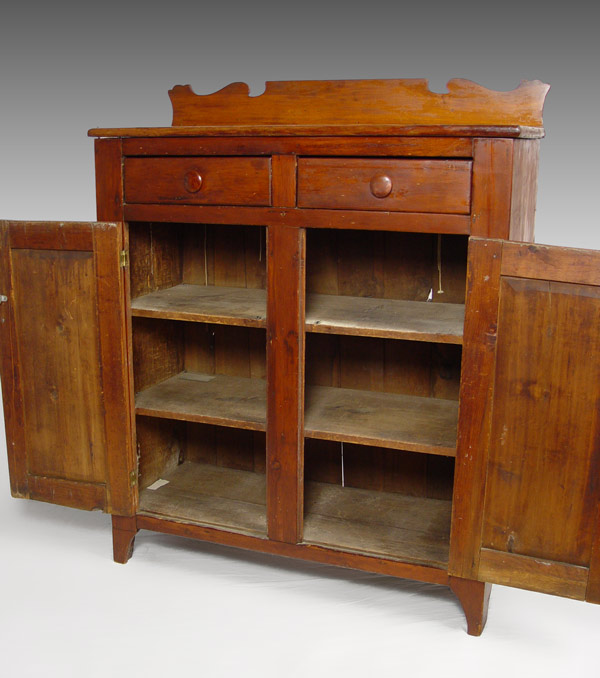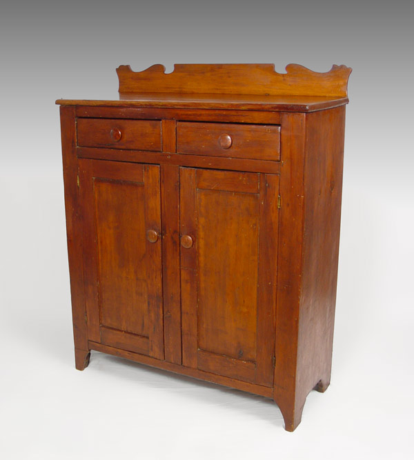 19TH CENTURY AMERICAN COUNTRY PINE JELLY CUPBOARD: 2 drawer over 2 door with 2 interior shelves. Whale tail cut backsplash. Base with high cut out. Note: refinished condition.43 ½'' wide, 17 ½'' deep, 53'' tall