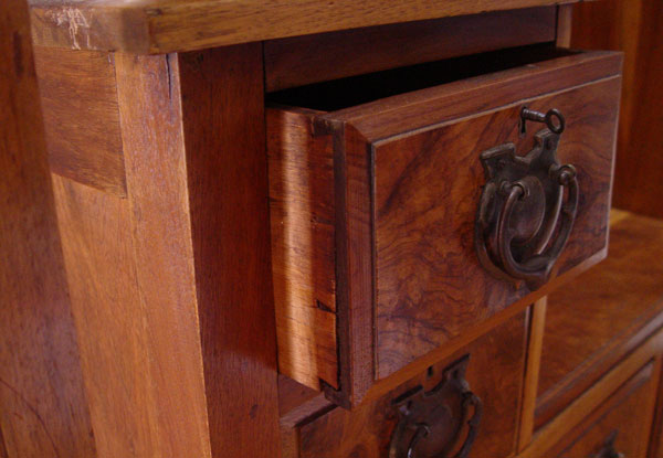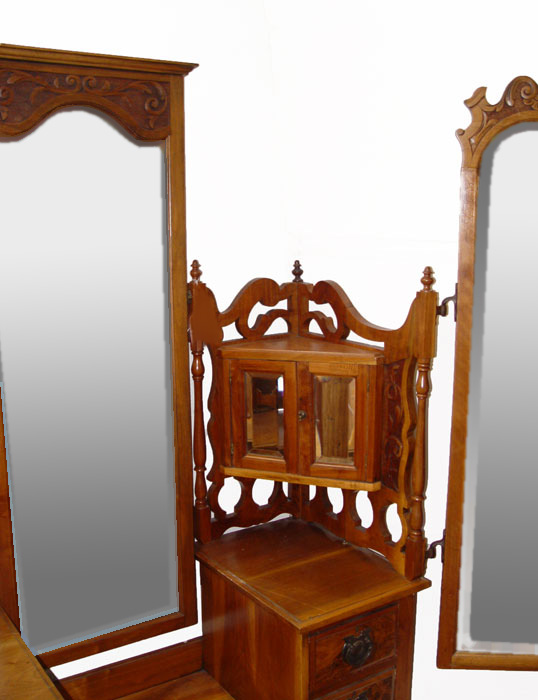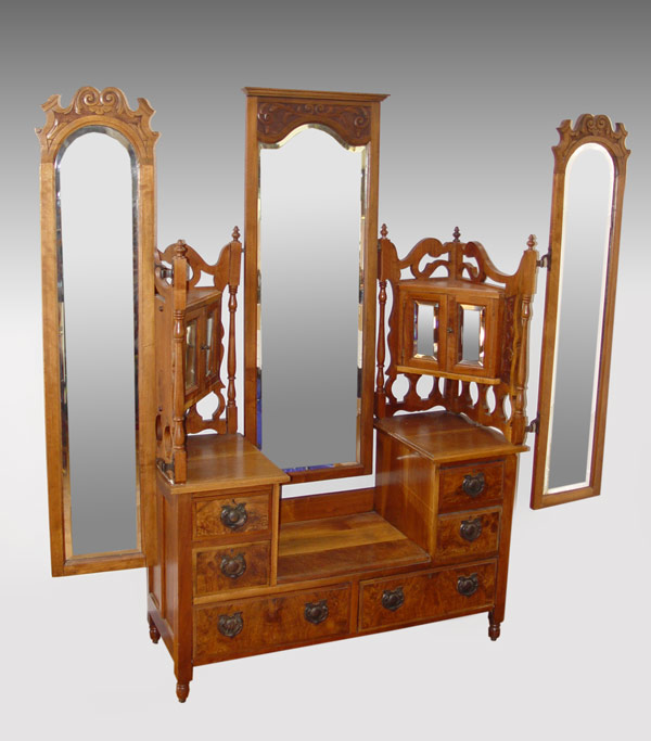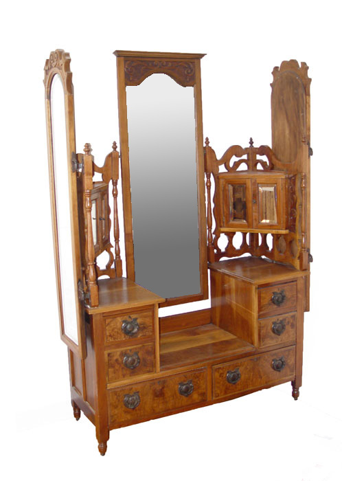ELABORATE VICTORIAN CHERRY GULL WING DRESSING STAND: Cherry and burl veneer. Central swivel full length mirror, flanked by double door beveled mirror corner cabinets. Each side has a hinged Gull wing full length mirror. 2 over 2 drawer base with drop well. 52'' wide, 19 1/2'' deep, 75'' tall.