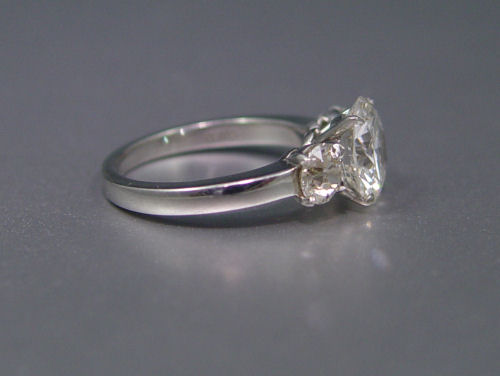 PLATINUM 3 STONE DIAMOND RING WITH 2.85 CT CENTER: Platinum ring centering a Round Brilliant, approx. 2.85 Ct diamond of I1 clarity and I color. There are 2 additional old European round cut diamonds, approx. .98 Ct., averaging VS1 in clarity and I-J in color. All stones are prong set. Weight 7.5 grams. Size 7. Sold with current Florida Diamond Appraisers GIA graduates appraisal for $22,250.