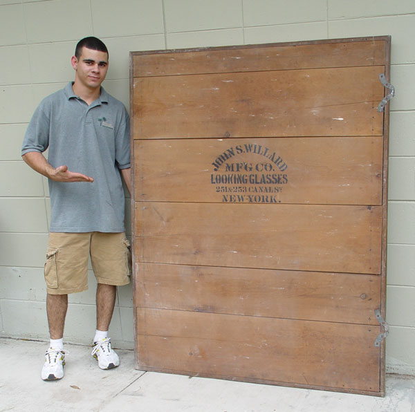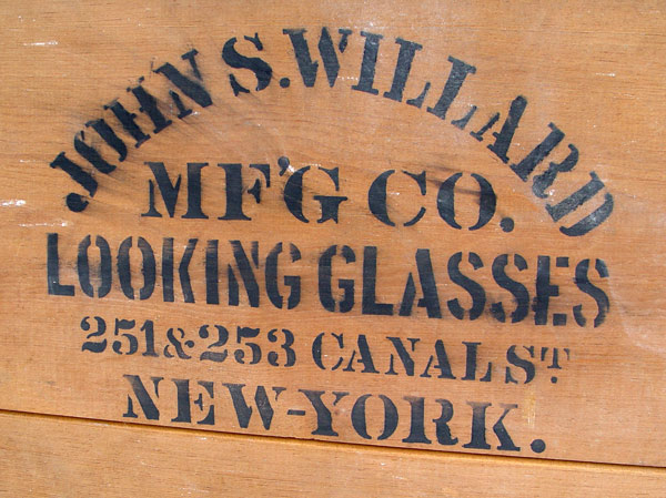 JOHN WILLARD VICTORIAN GESSO AND GILDED STRAIGHT FRAME MIRROR: Flat tapered moulding with double interior frame. Note some flakes to gilt. Made by ''John Willard Looking Glasses 257 Canal St. New York'' (stenciled on back). 63'' h x 52'' x 3''.