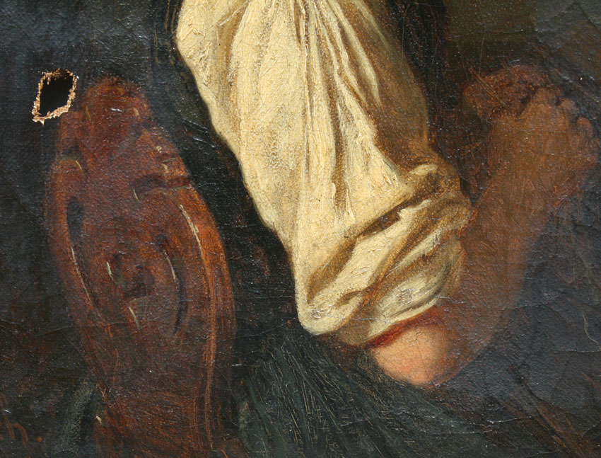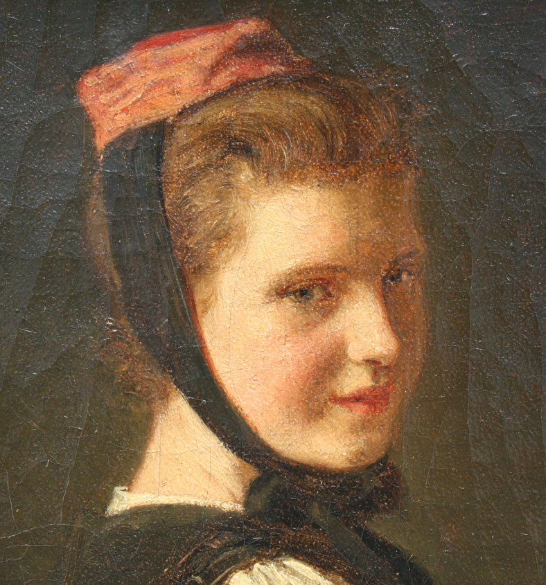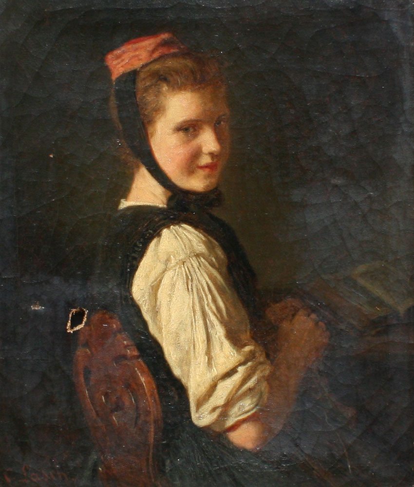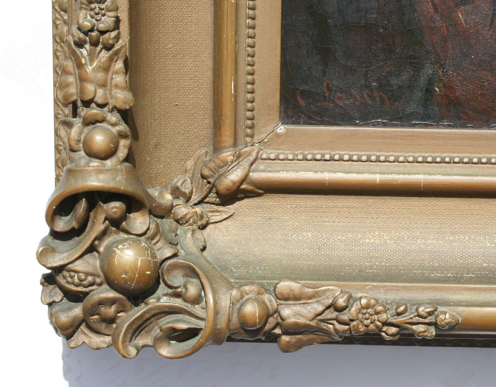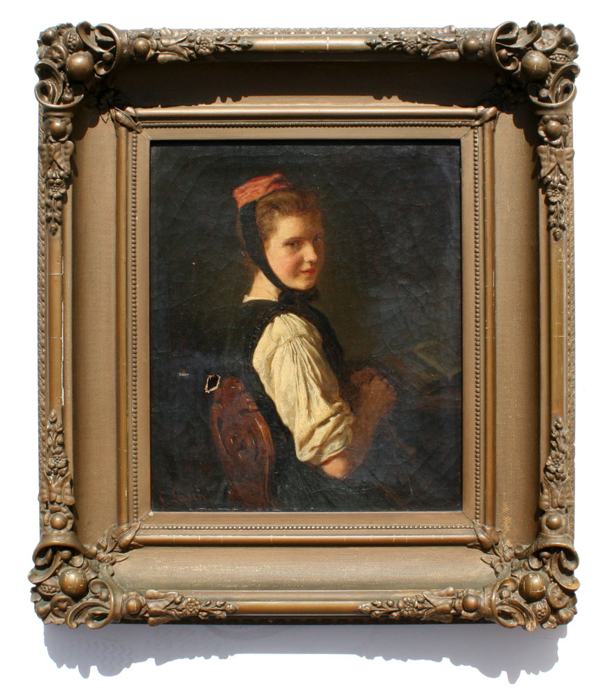 LASCH, Carl Johan, (German, 1822-1888): Portrait of a Young Maiden, Oil/Canvas, 12 1/2'' x 10 1/2'', signed, period carved and gilded gesso frame with wear, 19 1/4'' x 17 1/2''. CONDITION: Needs cleaning, several small punctures, scattered cracklure.