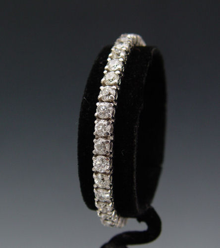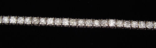 13 CT DIAMOND LINE OR TENNIS BRACELET: A substantial 14K white gold bracelet with a blend of 38 round brilliant, transitional round and old European round cut diamonds. Total diamond weight is approx. 13 Ct., averaging VSI - SI2 in clarity and H-K in color. Diamonds are prong set. Locking closure with hidden safety catch. 7'' length. Weight 20 grams. Sold with current Atlanta Gemological Laboratories GIA graduates appraisal for $35,500.