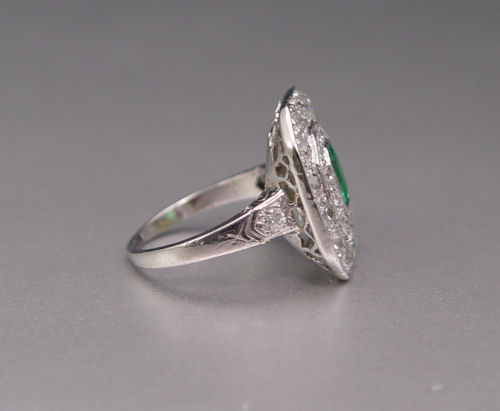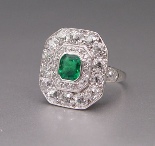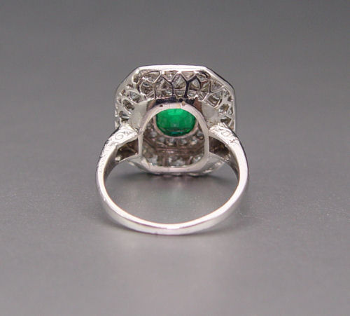 EDWARDIAN PLATINUM EMERALD AND DIAMOND RING: Platinum ring contains thirty four old European round and single cut round diamonds. Weight: 2.50 Ct. Approx. The diamonds average VS in clarity and G-H in color. At the center is one emerald cut emerald. Weight: 1.00 Ct. Approx. Rated VS in clarity (Type III), G in Hue 5 in tone and 5 in saturation. The emerald is slightly abraded. The diamonds are bead set. The emerald is bezel set. Weight: 8.0 grams. Size: 6.5
