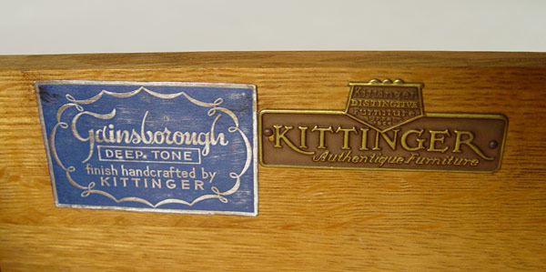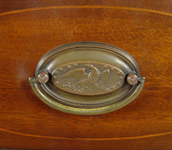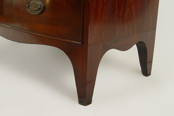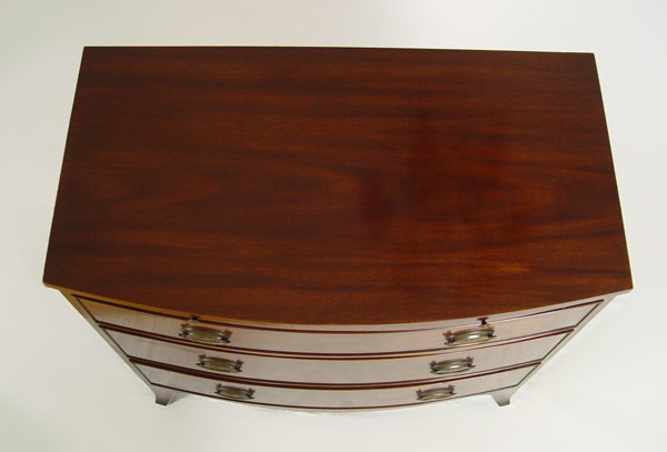 KITTINGER HEPPLEWHITE STYLE SPLAYED LEG CHEST: Gainsborough Pattern A691. String inlay oval on the top of drawer of three graduated drawers with oval brass pulls. 36'' wide, 18'' deep, 35'' tall.