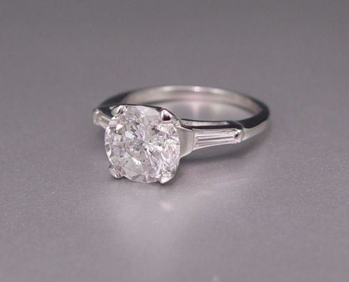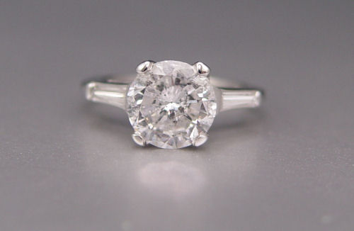 14K 2.43 CT DIAMOND RING: 14K white gold rig centers a single 2.43 ct round brilliant cut diamond, approx. 2.43 Ct., I1 in clarity (laser treated) and G color. The center stone is flanked by 2 tapered baguette cut diamonds, approx. .20 Ct. Size 6. Weight 4.2 grams. Sold with current Atlanta Gemological Laboratories GIA graduates appraisal for $16,825.