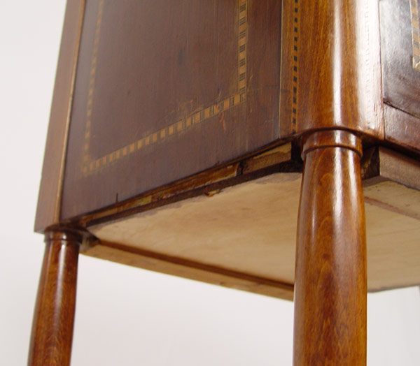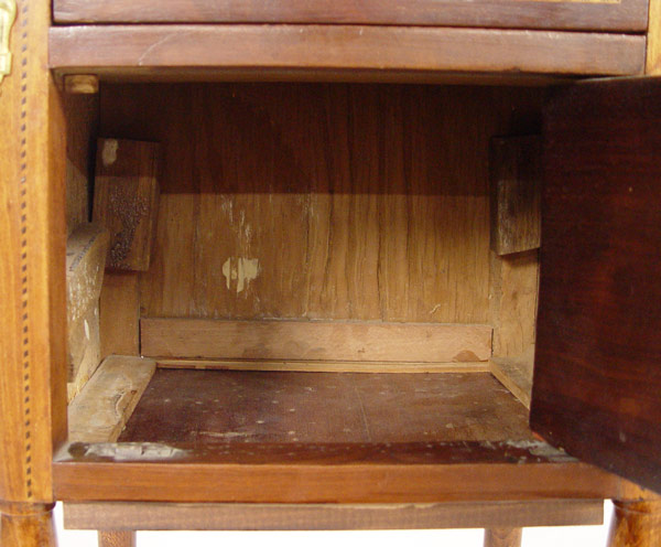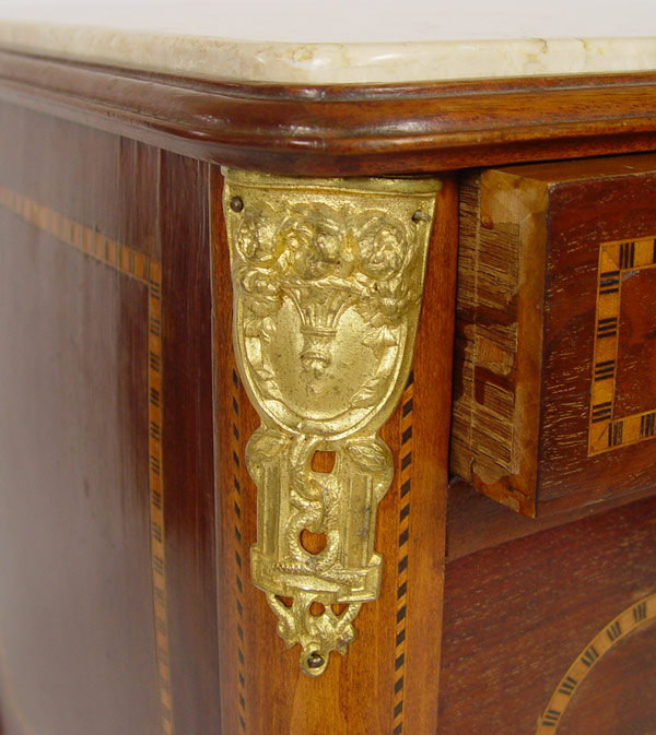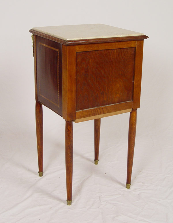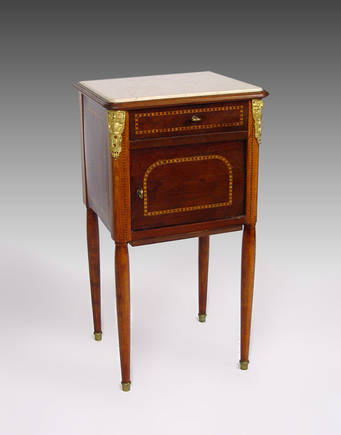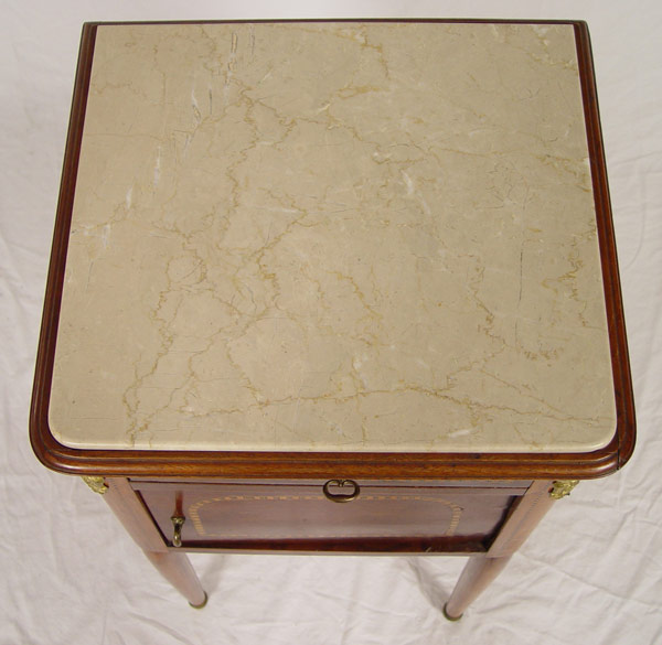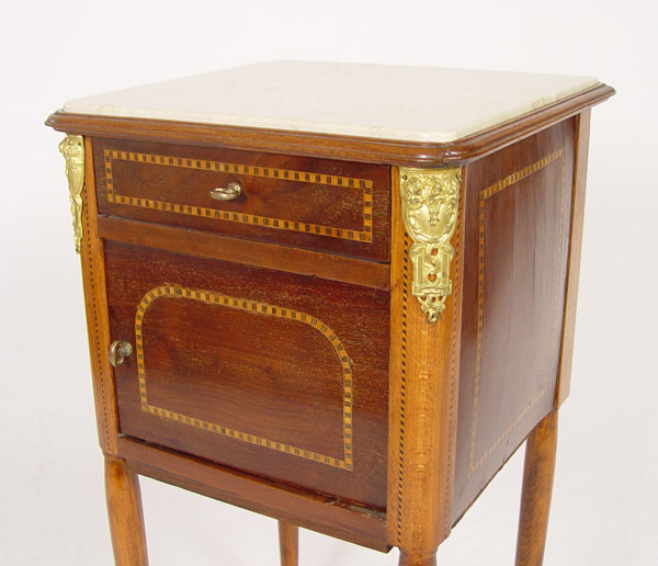 FRENCH STYLE MARBLE TOP PARQUETRY INLAY STAND: One drawer over one door, ormolu mounts, straight tapered legs. 33'' tall x 18'' x 12''.