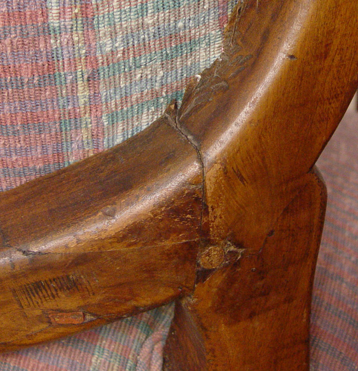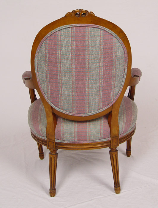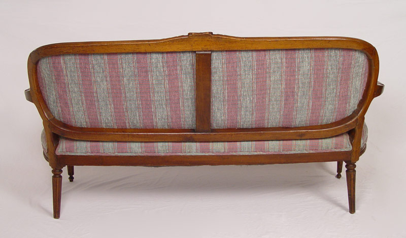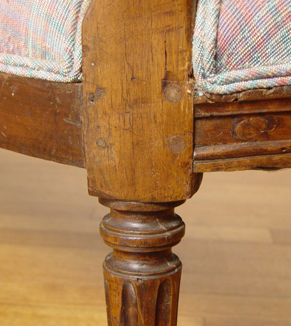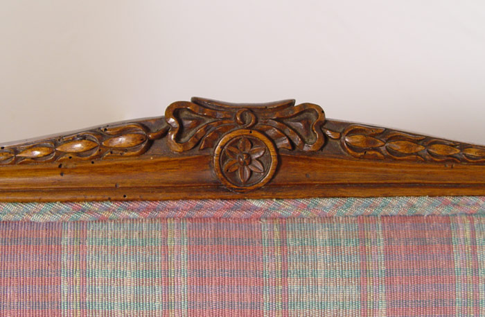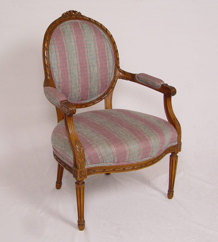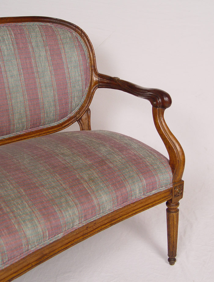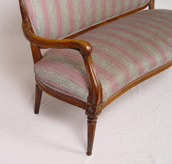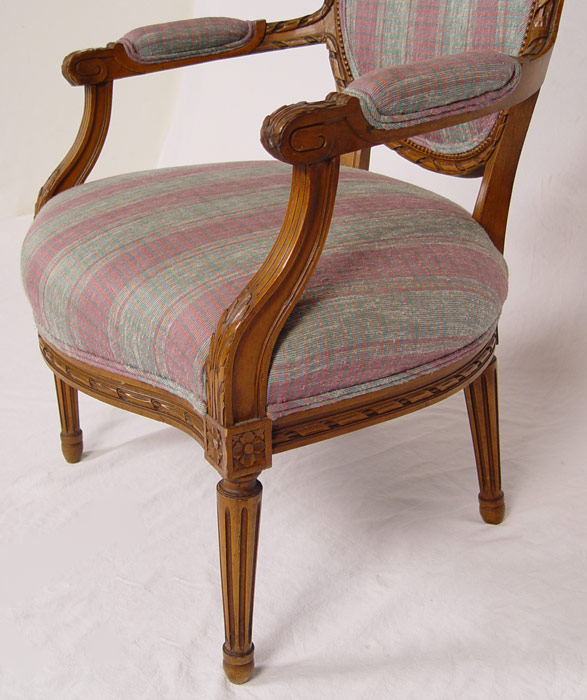 LOUIS XVI CARVED WALNUT SETTEE & CHAIR: Walnut open arm settee with gracefully carved arms and supports. Straight reeded legs, pegged construction, later upholstery, 35''h. x 66'' length x 26'' deep. The fauteuil is a companion piece carved in a similar design, same later fabric.