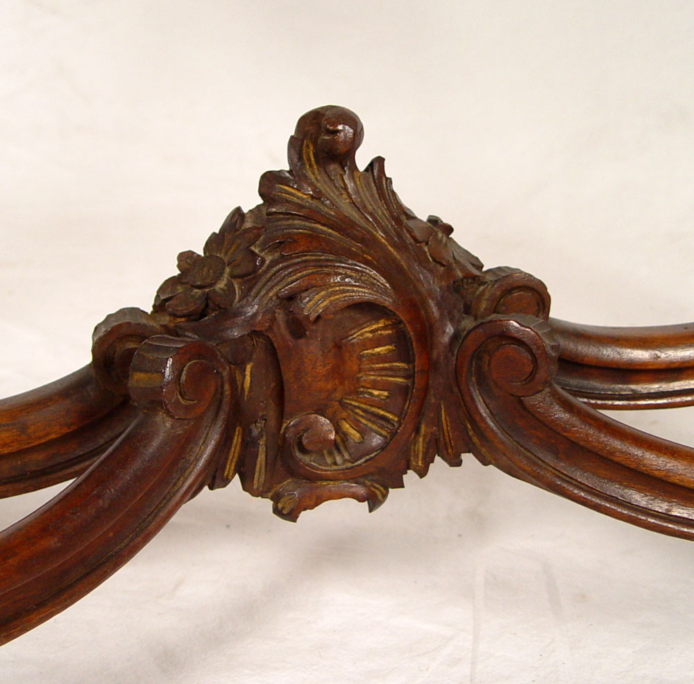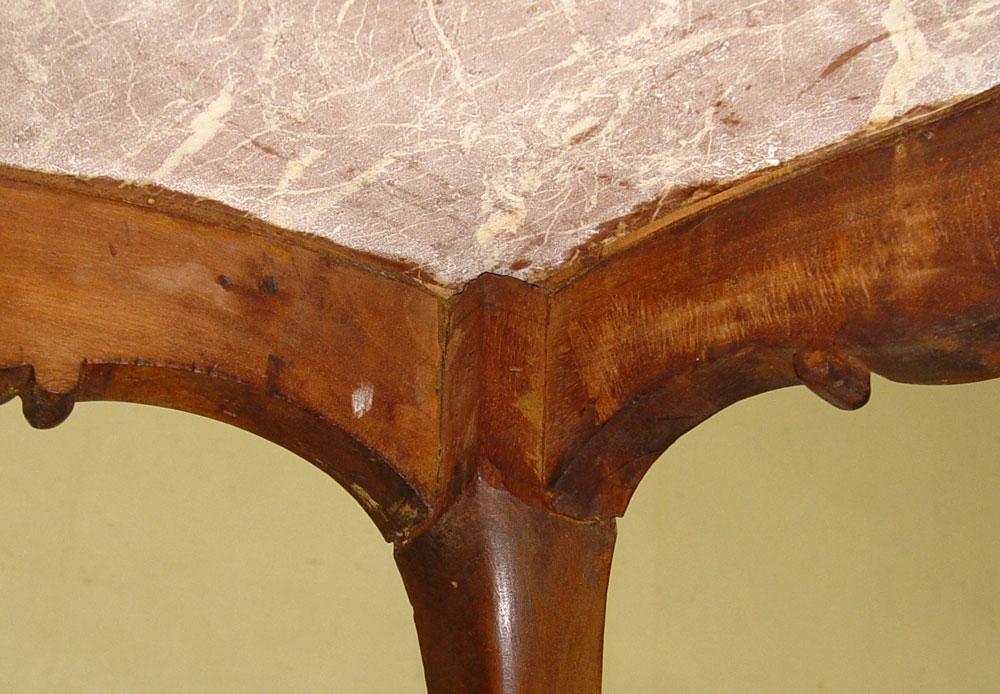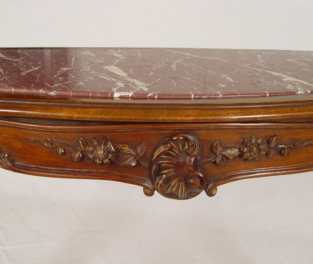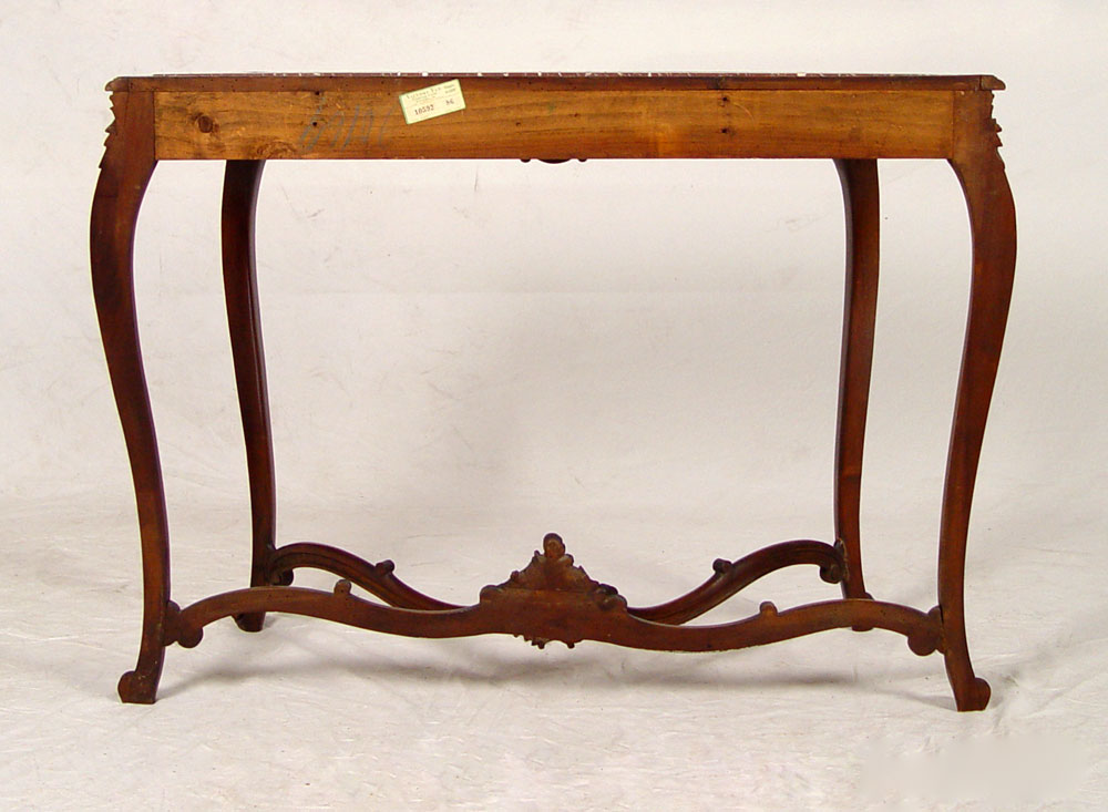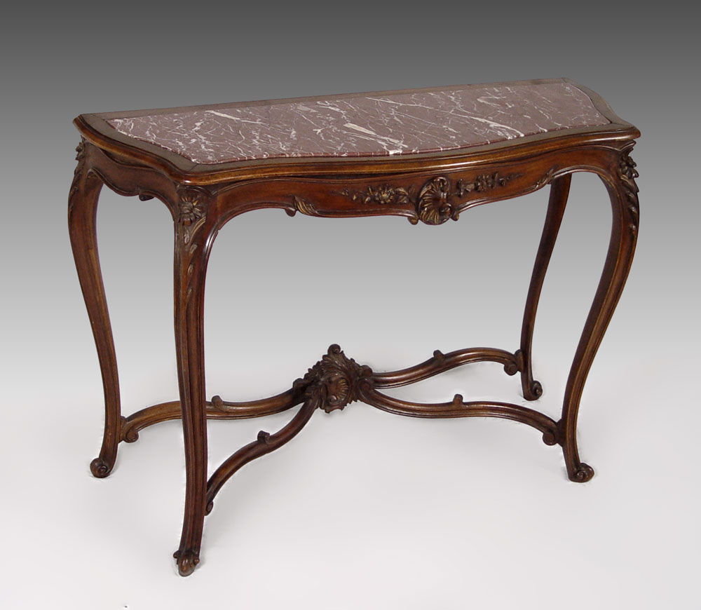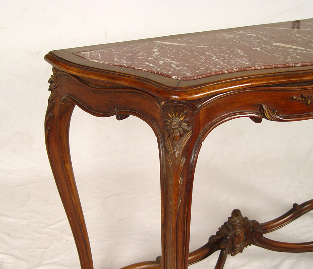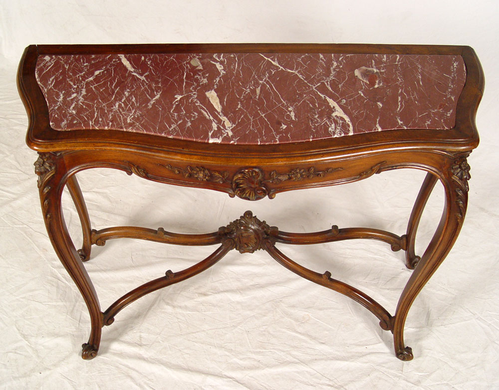 FRENCH CARVED WALNUT MARBLE TOP HALL TABLE: Shaped marble top on carved walnut frame, craved apron and cabriole legs joined by curved stretchers. 37''h. x 44'' x 17.5''.