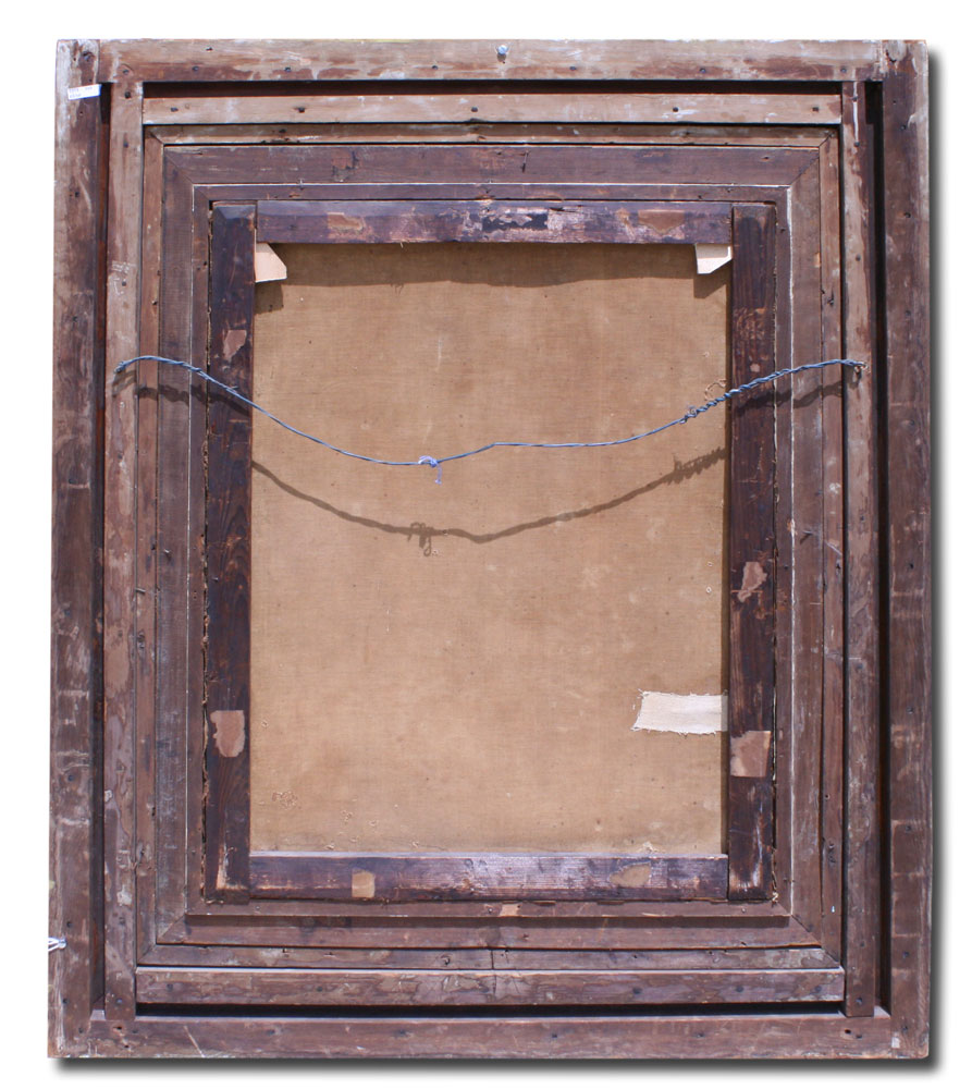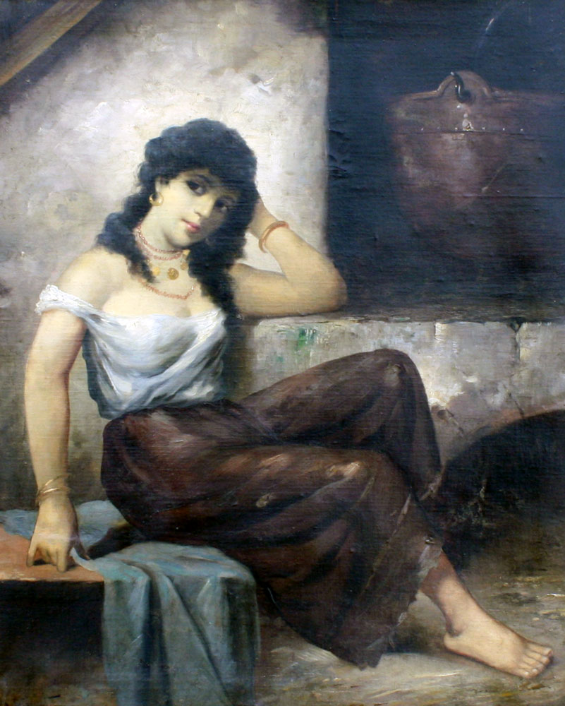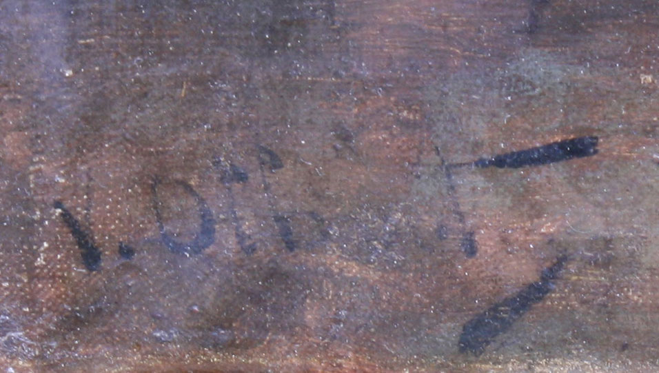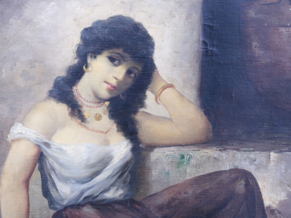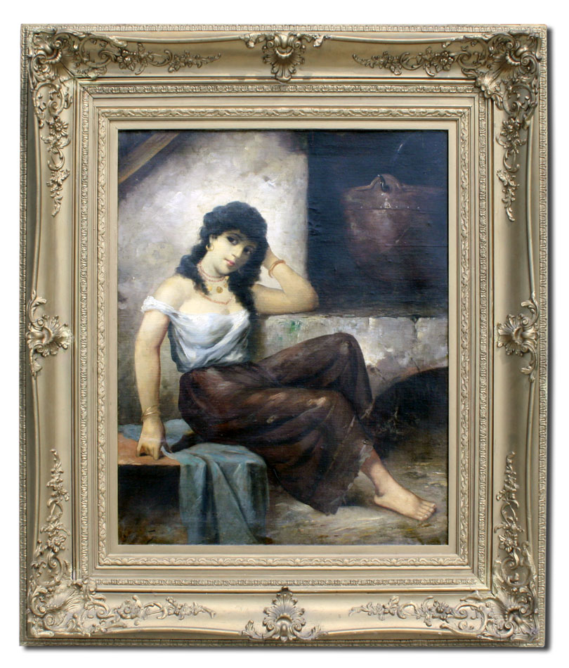 ILLEGIBLY SIGNED PAINTING OF A MAIDEN : OIL/Canvas, 22 1/8'' x 28 1/8'', period gilded gesso frame with wear and need of repair, 29'' x 34 1/2'', circa 1900.