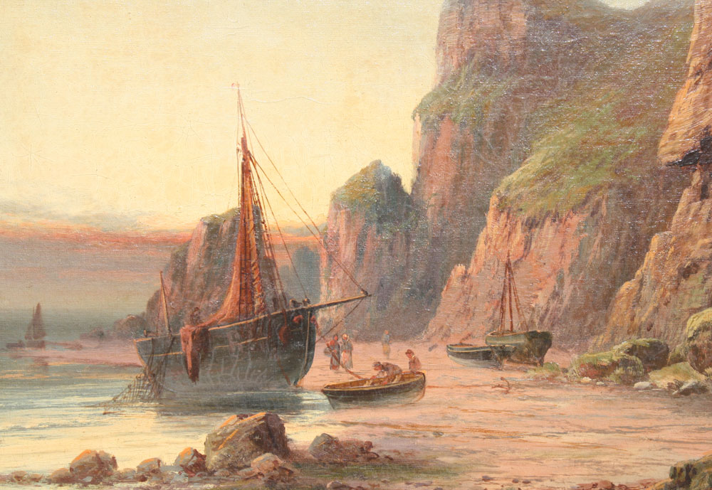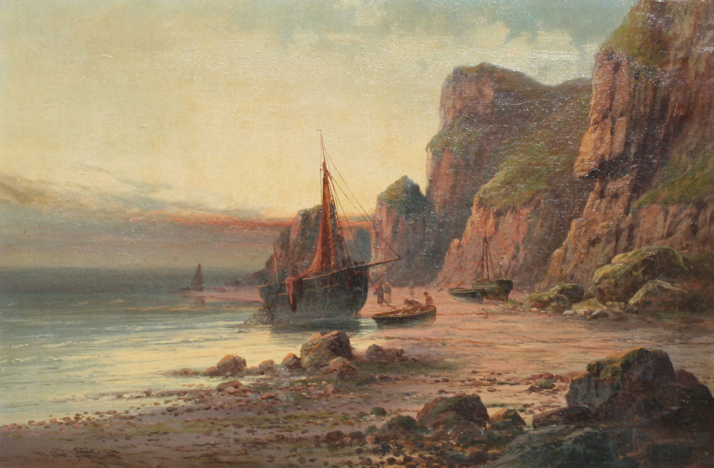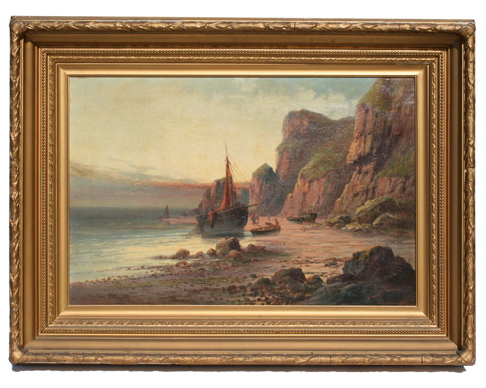 HIDER, Frank, (English, 1861-1933): European Coastal scene with Boats, OIL/Canvas, 20'' x 30'', signed, heavy period gilded and carved deep dish frame with some wear, 30'' x 40''.