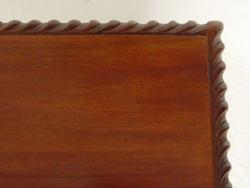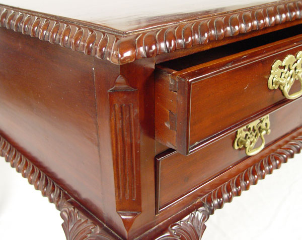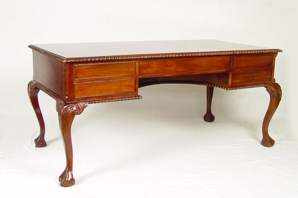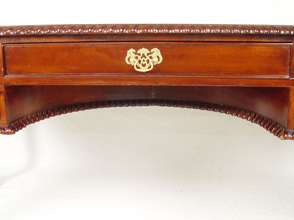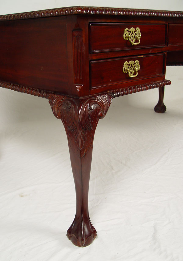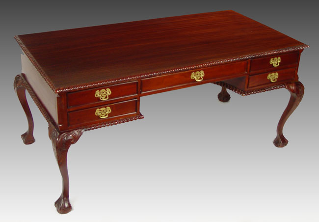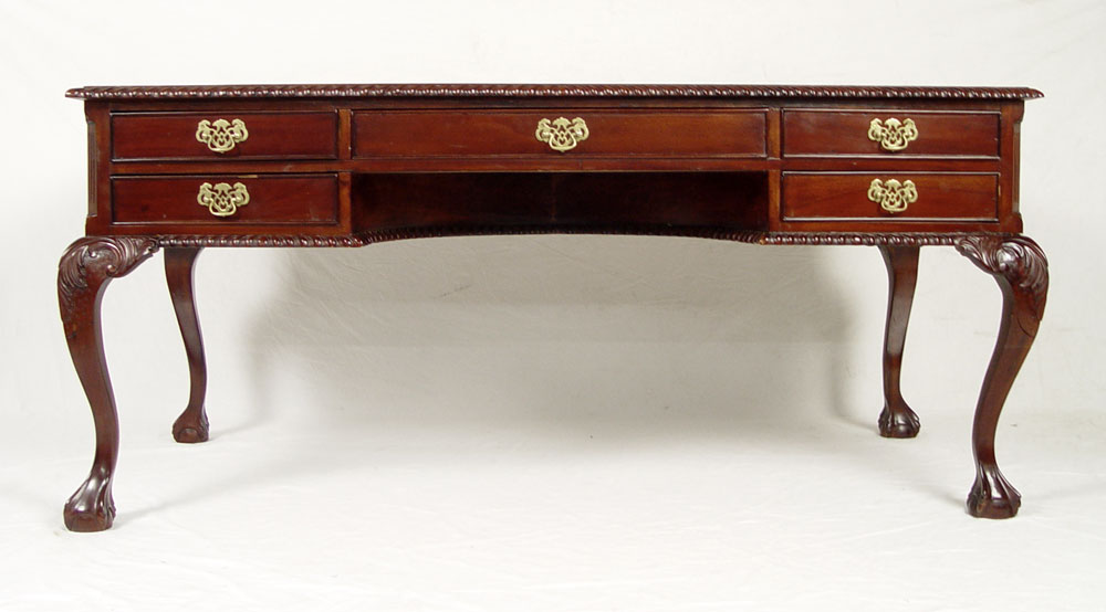 CHIPPENDALE STYLE WRITING TABLE: Mahogany writing table with gadroon edging, cabriole legs, ball and claw feet. 5 drawers. 30'' tall x 65'' x 35''.