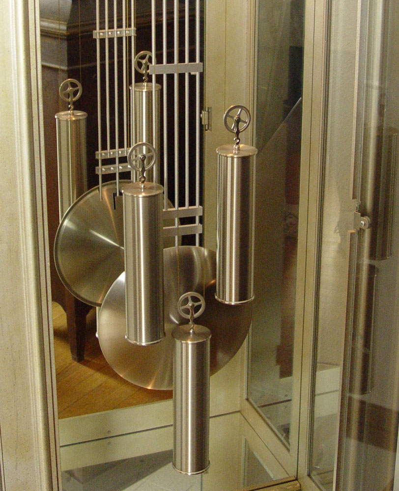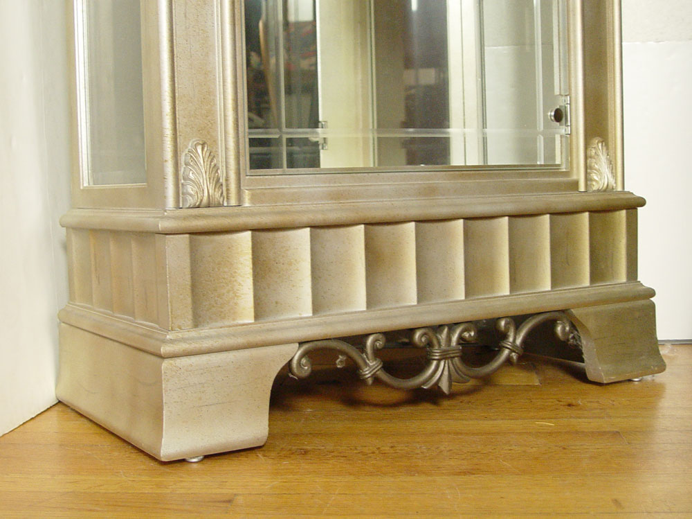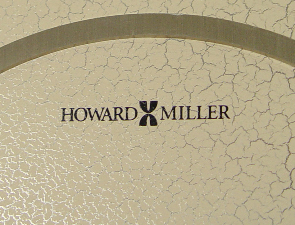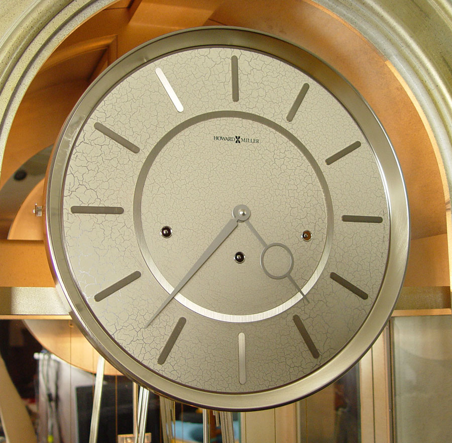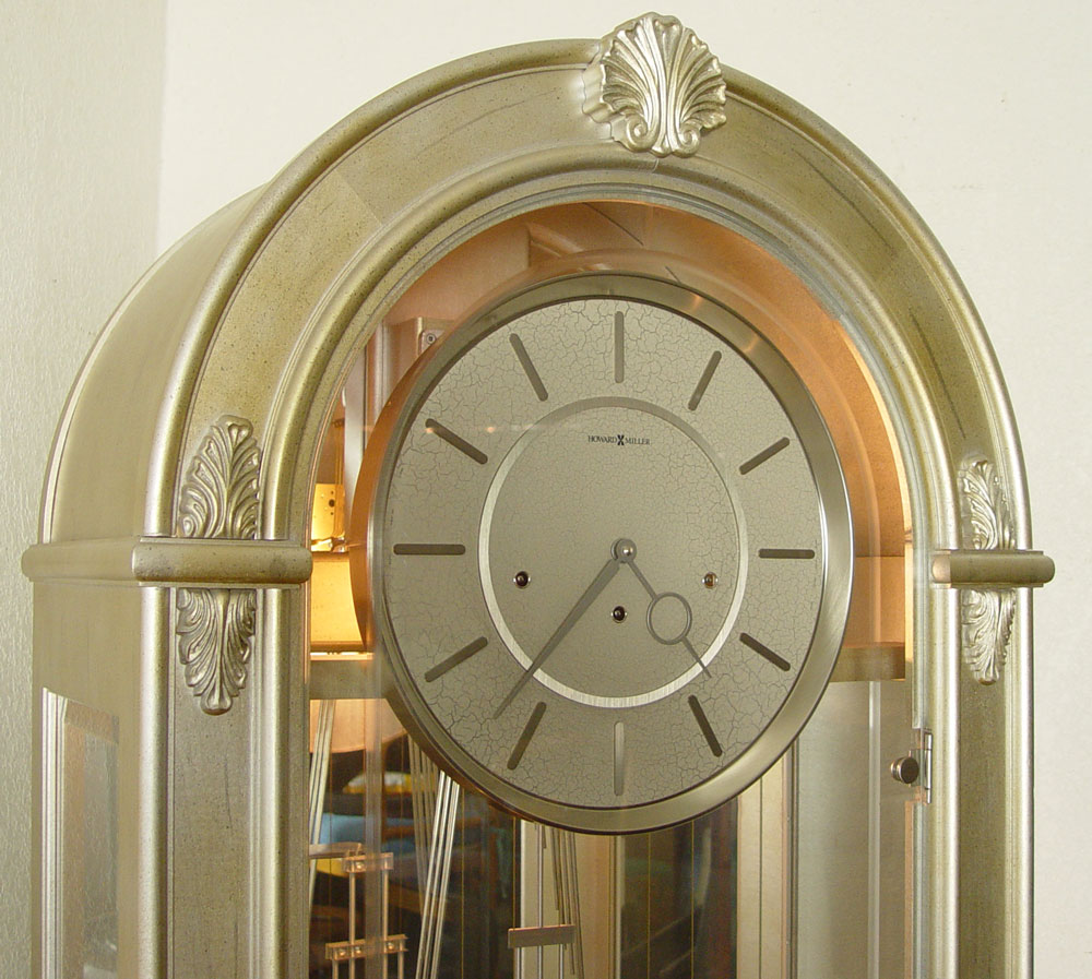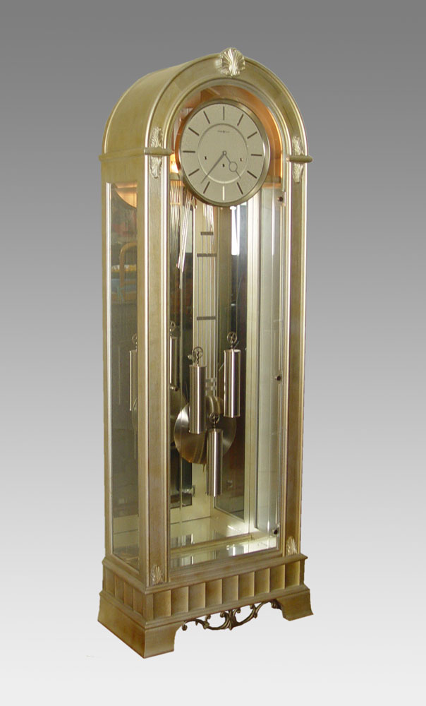HOWARD MILLER ''COASTAL POINT'' GRANDFATHER CLOCK: Model number 610-898. Illuminated arched cabinet with platinum finish on parts. The dial has a crackled finish and brushed nickel finish bezel, pendulum and weights. Cable driven, triple chime Kieninger movement with nighttime shut-off option. Manufacturers retail price is $4175. Approx. 84''h. x 30'' x 15''.