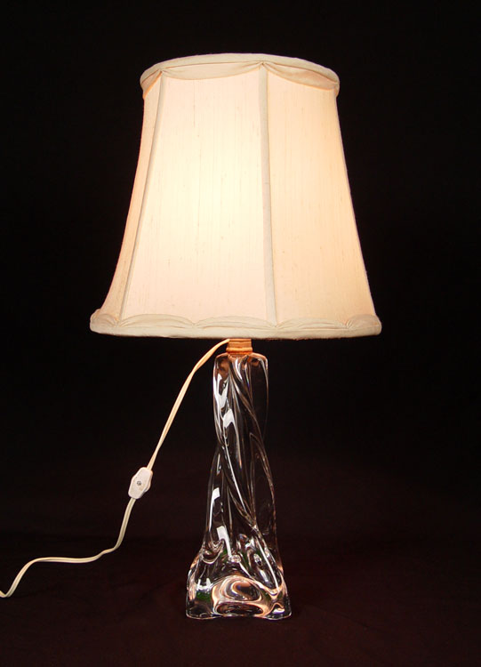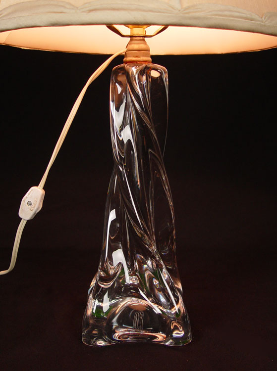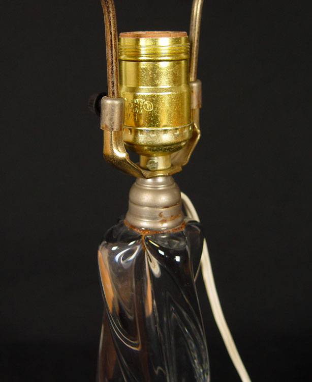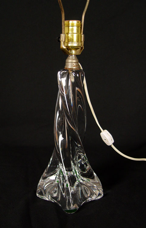 BACCARAT CRYSTAL LAMP: Fluted twist design, marked Baccarat France. Base measures 11 1/2'' h. x 6'' square. 24'' h. to finial.