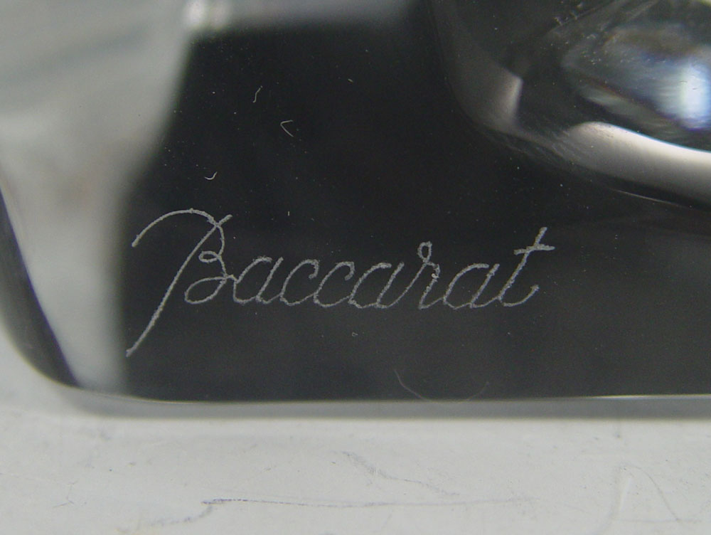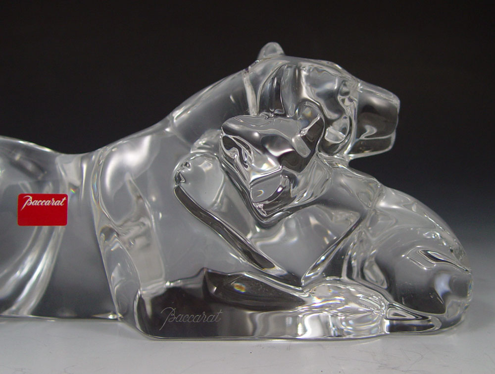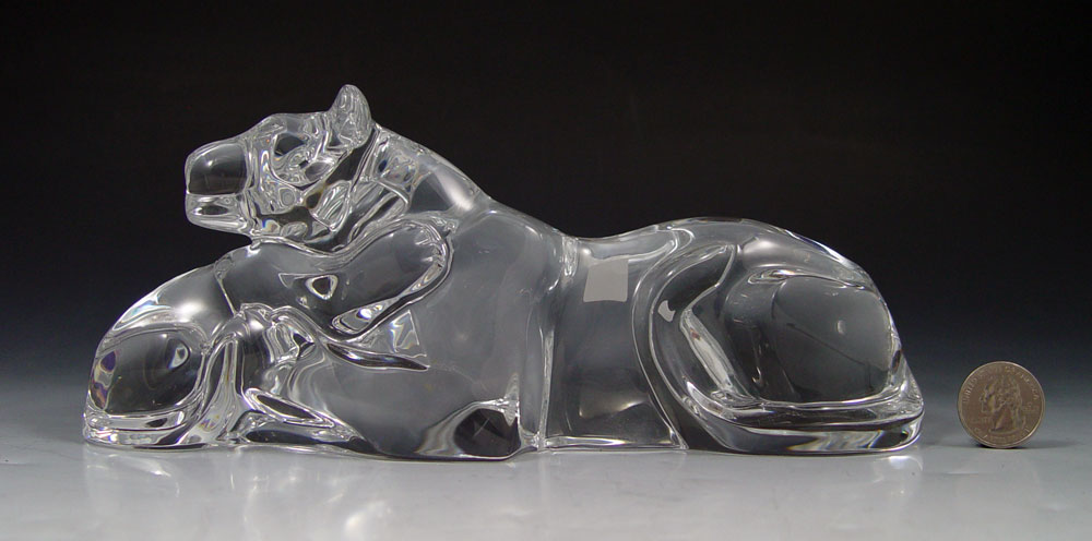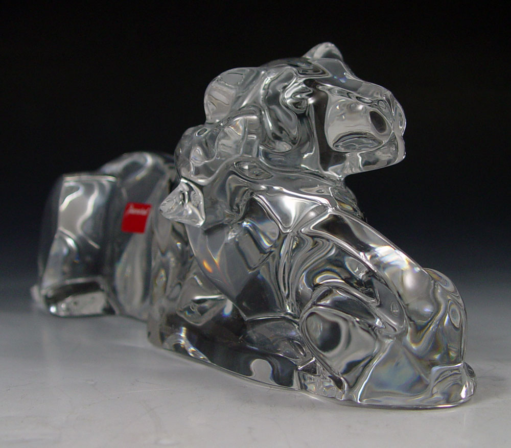 BACCARAT CRYSTAL LION & CUB FIGURE: Signed Baccarat with original sticker. 4'' h. x 9'' x 3''.