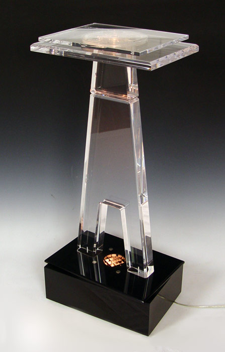 ACRYLIC A FRAME PEDESTAL: Revolving base with upward illumination. 40'' tall x 12'' square. The optional use spinning platform adds another 1 1/2'' to the height.
