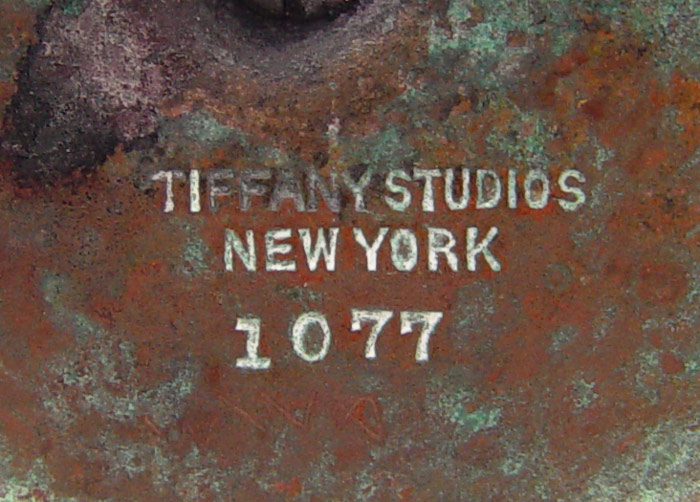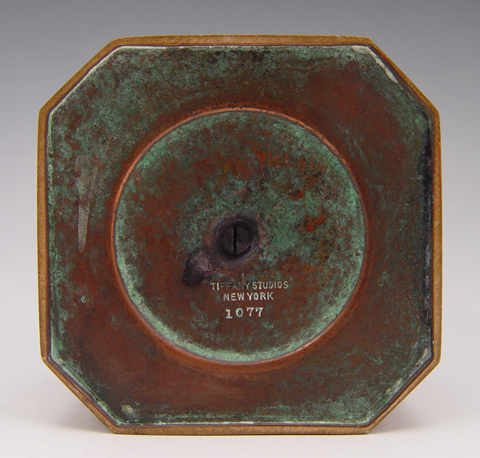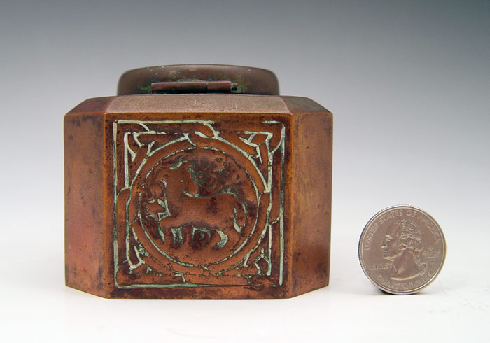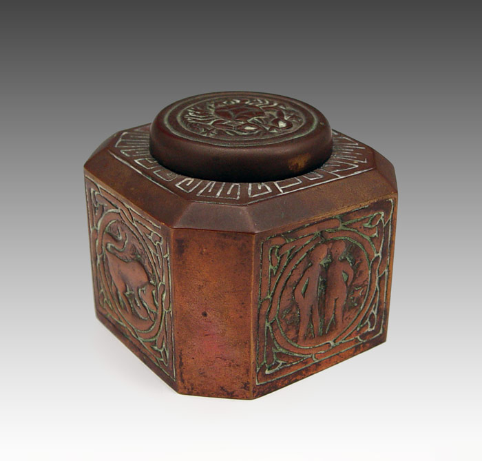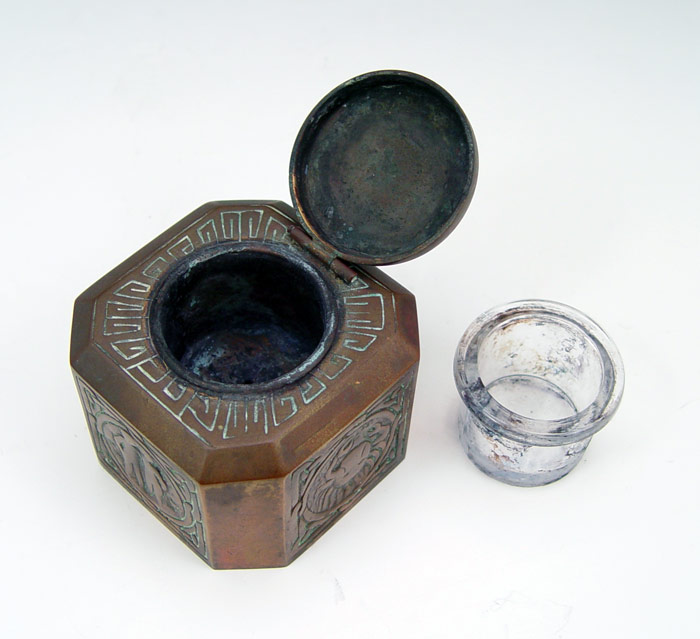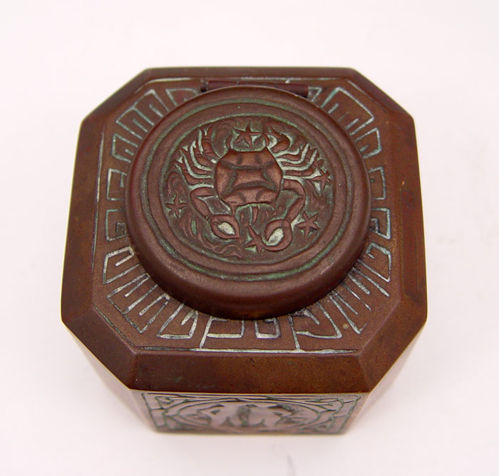 TIFFANY STUDIOS BRONZE ZODIAC INKWELL: Bronze inkwell with zodiac symbols for Taurus, Aries, Cancer, Gemini. Well marked Tiffany Studios New York 1077. Original glass insert present. 2 1/2'' h. x 3'' square.