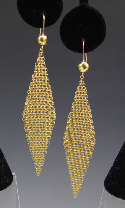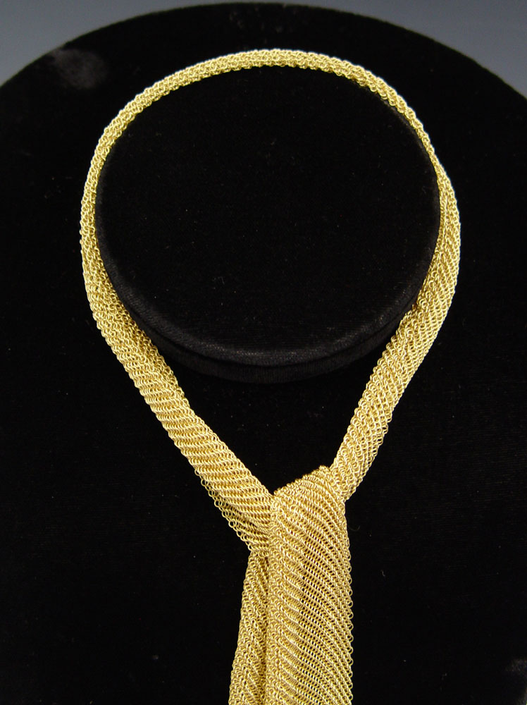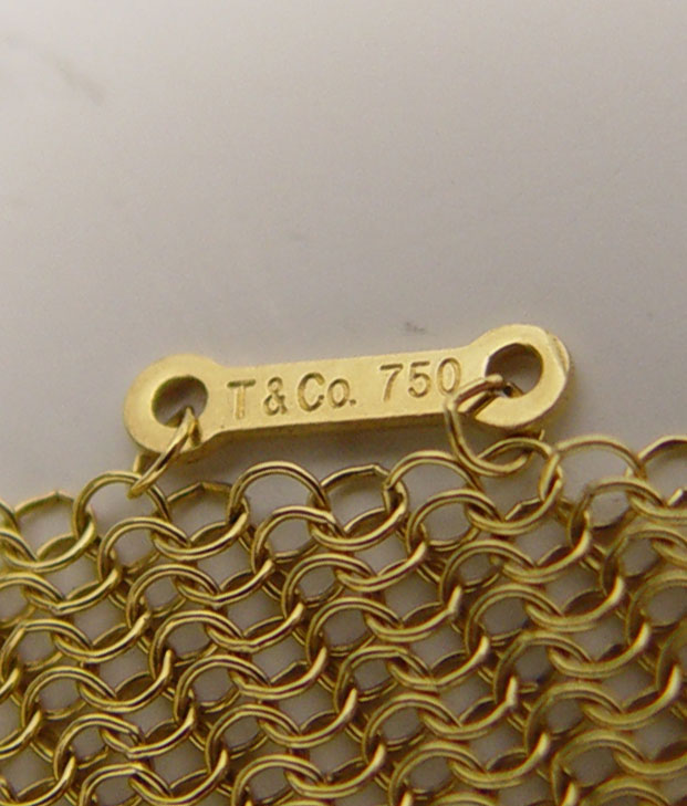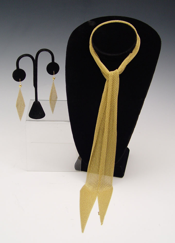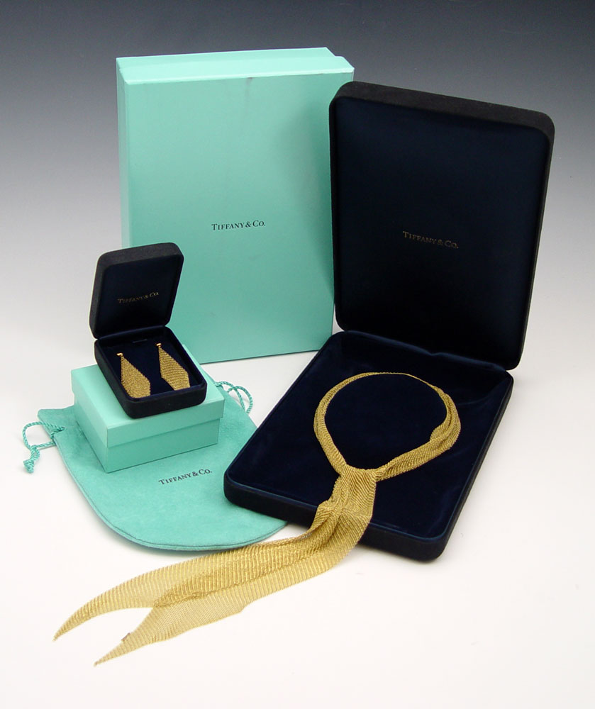 TIFFANY & CO. SCARF NECKLACE & EARRING SET: Designed by Elsa Peretti. 18K yellow gold mesh scarf necklace and earring set. The scarf measures approx. 1 1/4'' in width and 36'' in length. The earrings measure approx. 3/4'' x 1 1/4'' Shepherds hook closures on earrings. Weight: 93.2 grams.