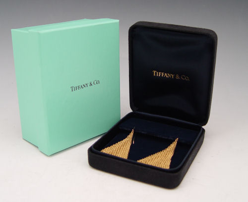 18K TIFFANY & CO. EARRINGS: 18K yellow gold mesh earrings. 3 1/4'' l. includes the shepherds hooks. Signed: T&Co. Weight: 14.5 grams.
