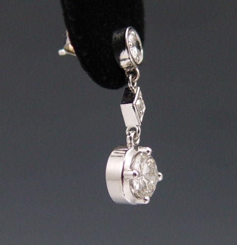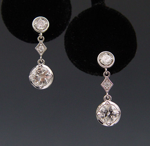 14K DIAMOND EAR PENDANTS: 14K white gold earrings each contain 1) Old European cut .65 Ct. diamond, rated I1 clarity and H color, with EGL report and number. 2) Old European round cut diamond, approx. .70 Ct., rated L1 in clarity and H color. There are also 4 Old European round cut diamonds , approx. .45 Ctw., SI in clarity and H-I-J color. Total diamond weight is 1.80 Ct. 7/8'' length. Weight: 3.5 grams. Sold with current Atlanta Gemological Laboratories GIA graduates appraisal for $5,250.