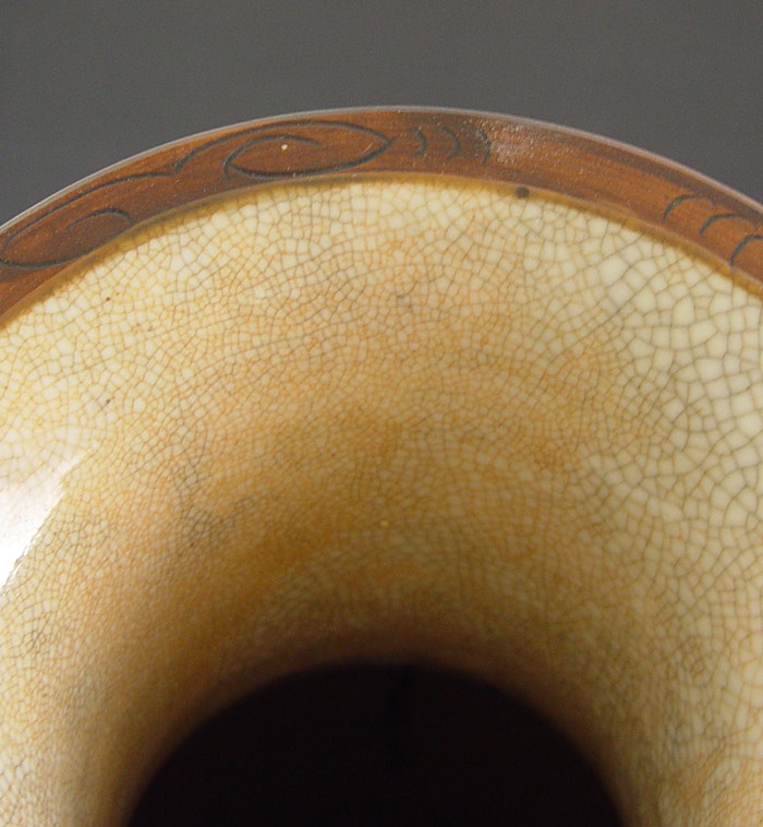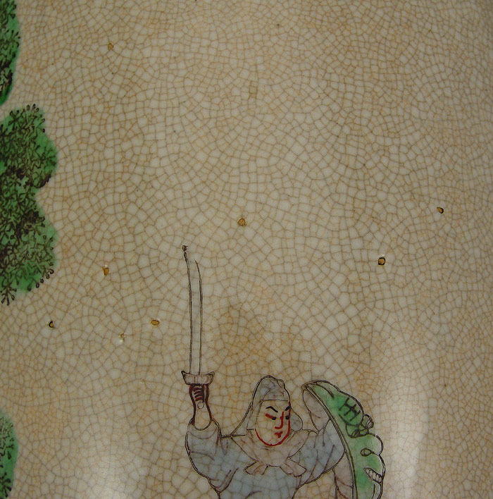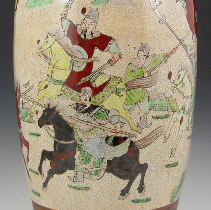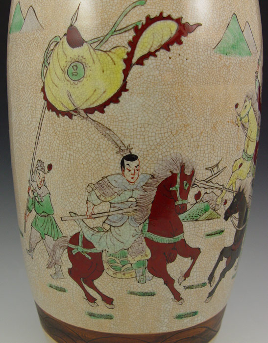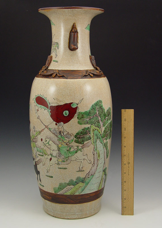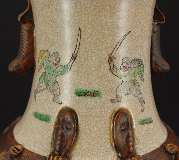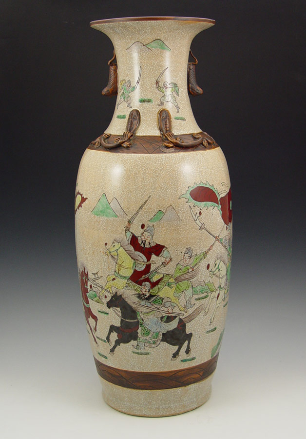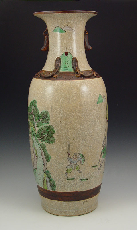 TALL CHINESE EARTHENWARE VASE: 23'' h. Hand painted and incised battle scene, raided serpents on the neck, all over crazed glaze, signed in characters on the underside.