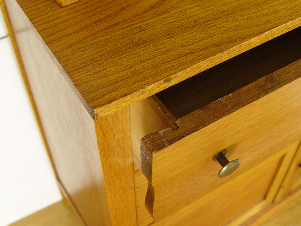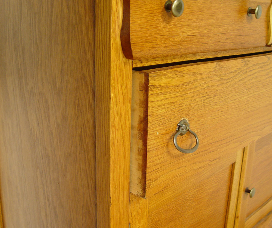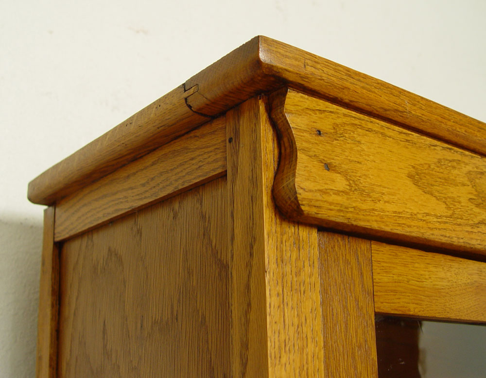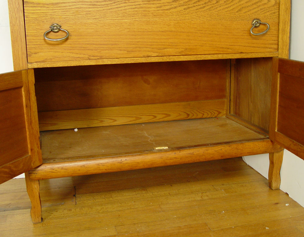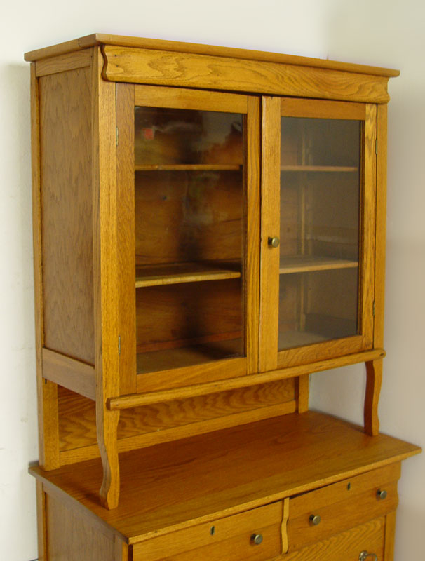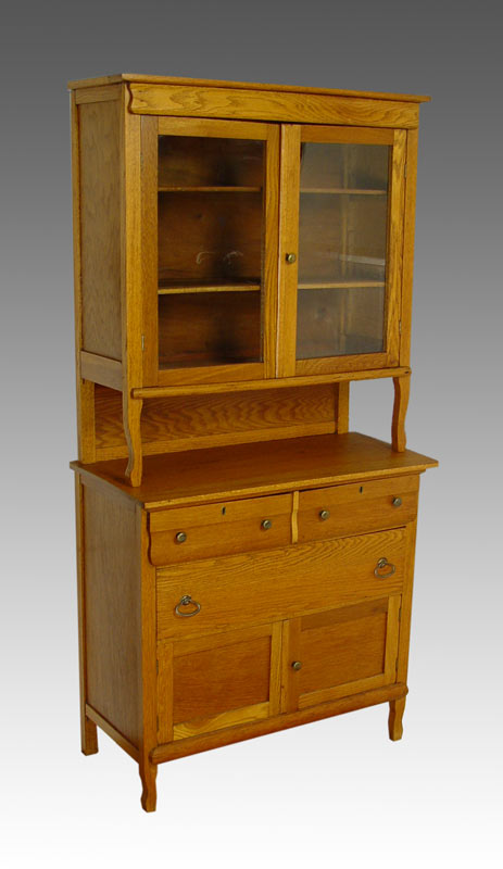 2 PART GOLDEN OAK COUNTRY HUTCH SIDEBOARD: Upper cabinet with glass doors, interior shelves. Supported by supports and backsplash. Base cabinet with two drawers over one drawer over 2 doors. Brass hardware. 79 1/2'' tall x 39 1/2'' x 20''.