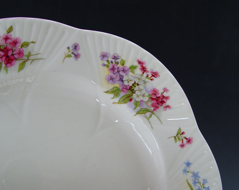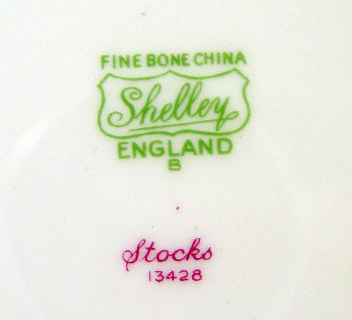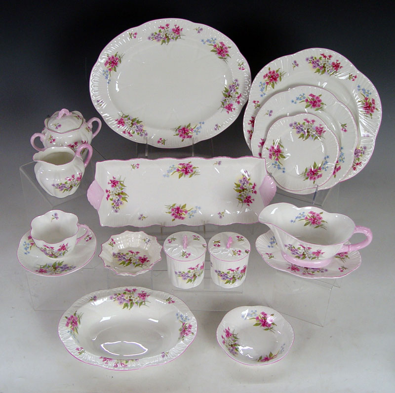 SHELLEY FINE BONE CHINA SERVICE FOR 12 IN THE ''STOCKS'' PATTERN 13428: 96 pieces to include 12 dinner plates 15 salad plates, 12 bread plates, 12 dessert bowls, 12 cups, 13 saucers, 3 nut dishes, 3 platters, 2 open oval vegetable bowls, gravy boat, gravy boat with attached underplate, 2 jam or mustard jars, 2 trays, creamer, covered sugar, individual creamer, and 2 pedestal compotes.
