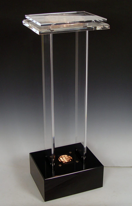 ACRYLIC 2 COLUMN PEDESTAL: Upward illumination from the base. 38'' tall, the top is 12'' x 15''. The optional use spinning platform adds another 1 1/2'' to the height.