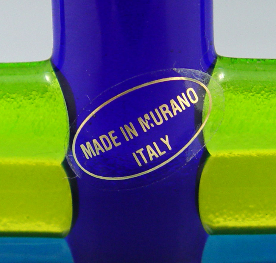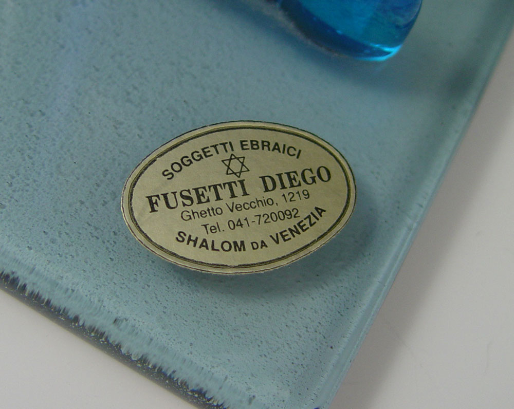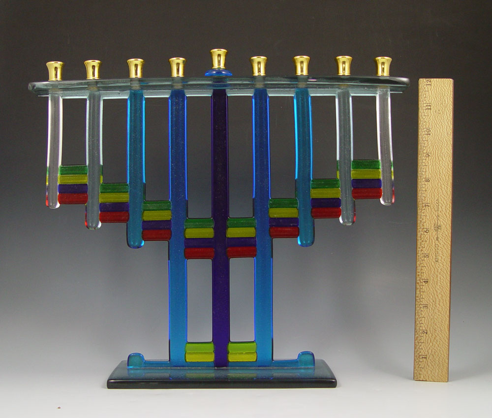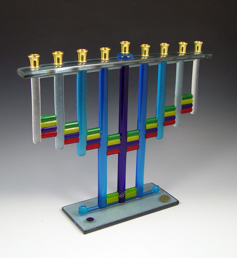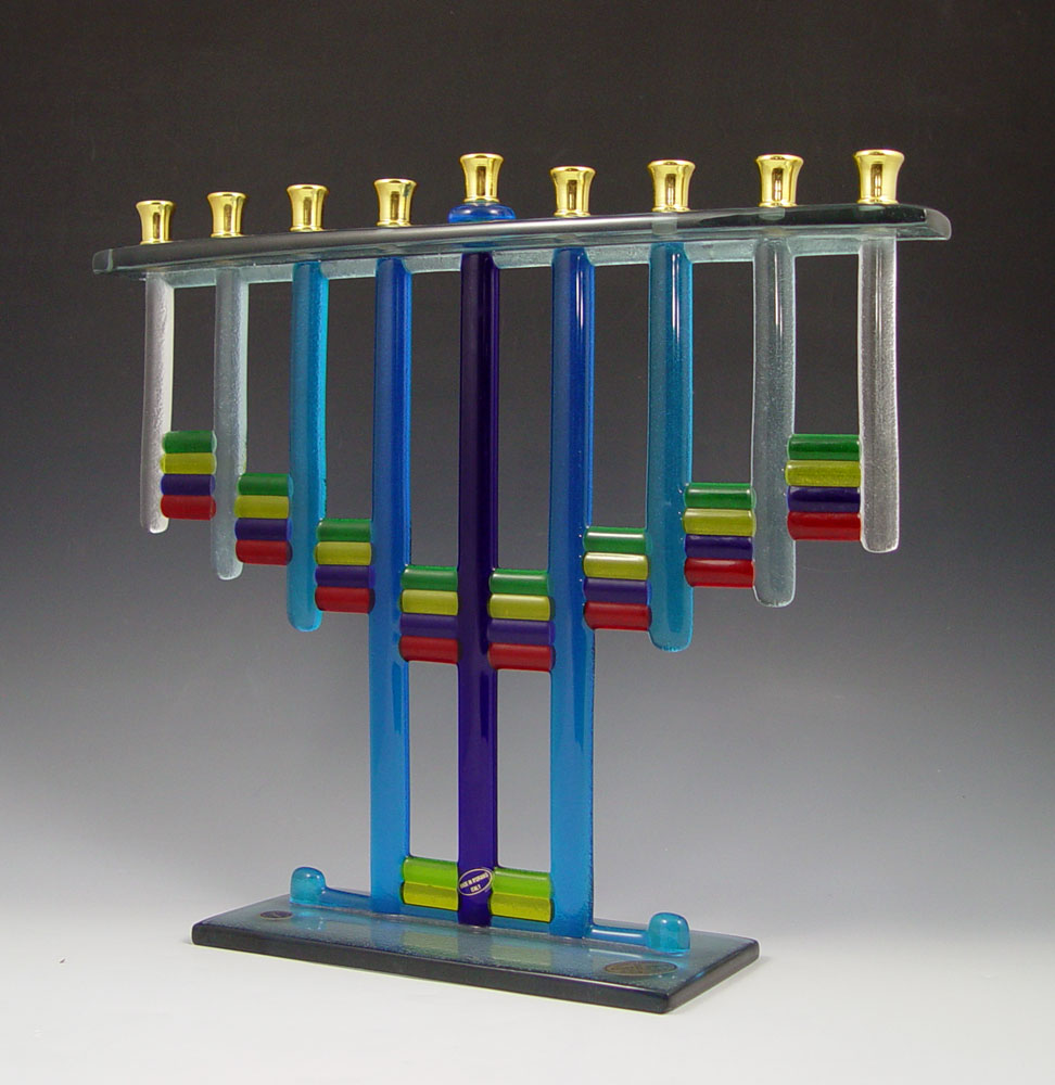 FUSETTI DIEGO MURANO GLASS MENORAH: Shalom da Venezia. Celebrate Hanukah with the colors of Murano, 13 1/2''h. s 15 1/2'' wide. Foil labels.