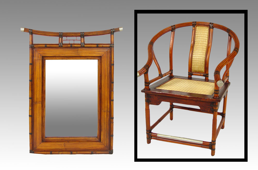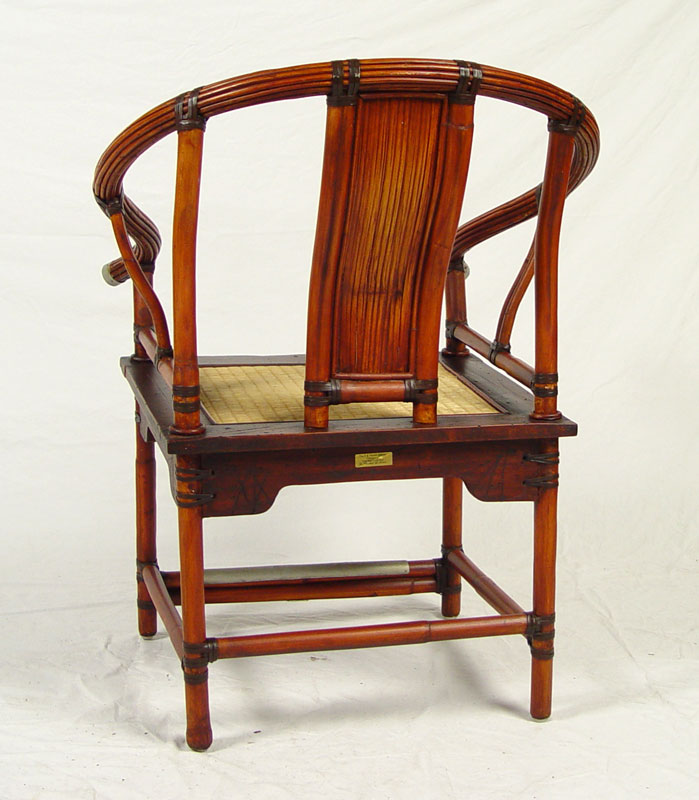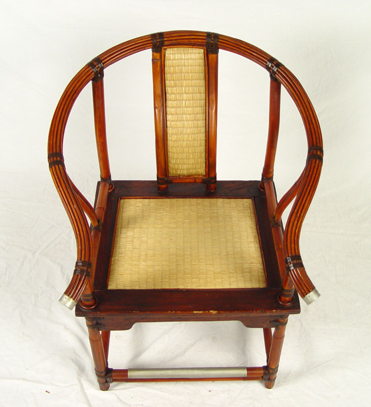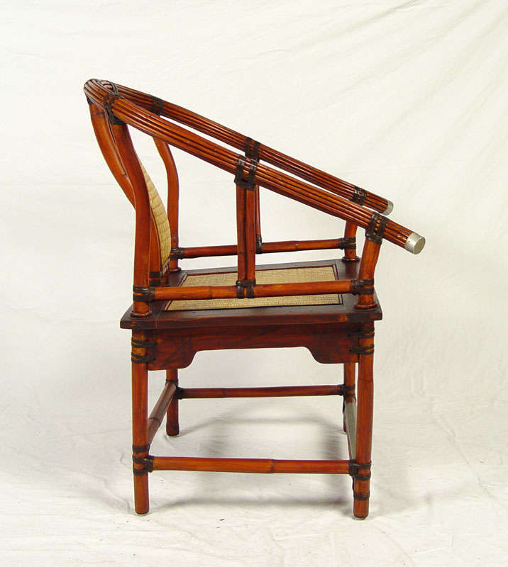 PALECEK MING ARM CHAIR: Asian design in rattan and wood with leather binding, grass matting over wood. 47''h. x 37''w. overall. The companion mirror is at the previous lot 211.