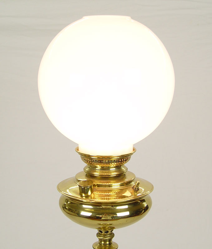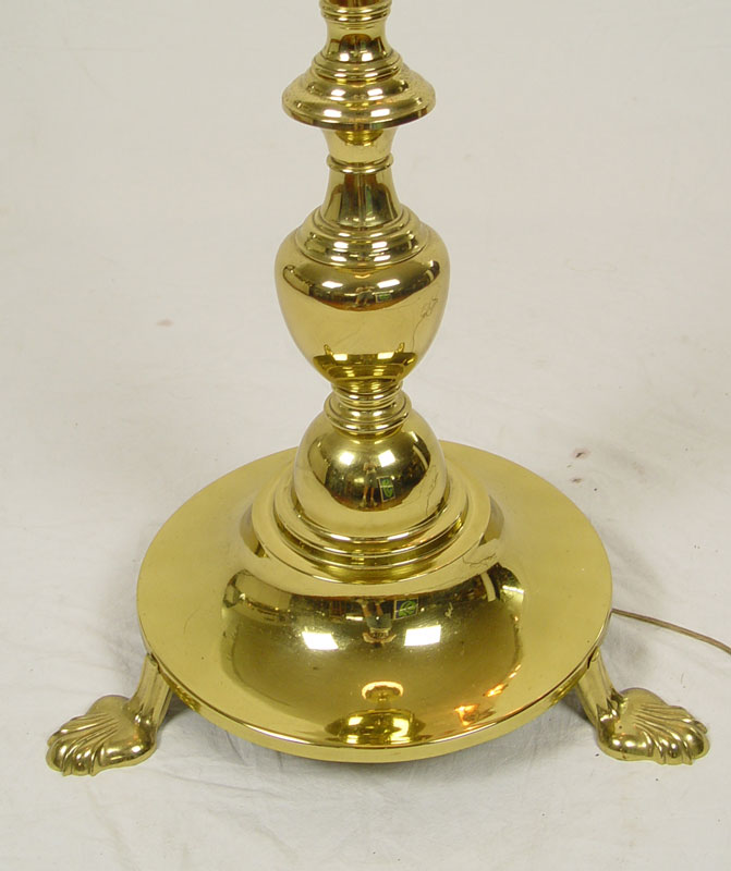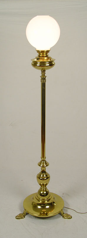 BRASS PAW FEET FLOOR LAMP: Heavy weighted base with paw feet. 55'' tall, excluding the glass globe shade.