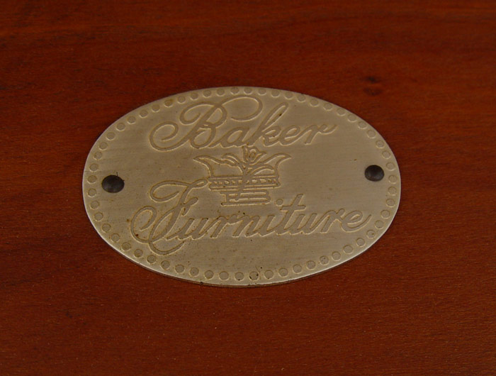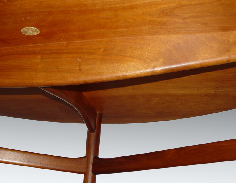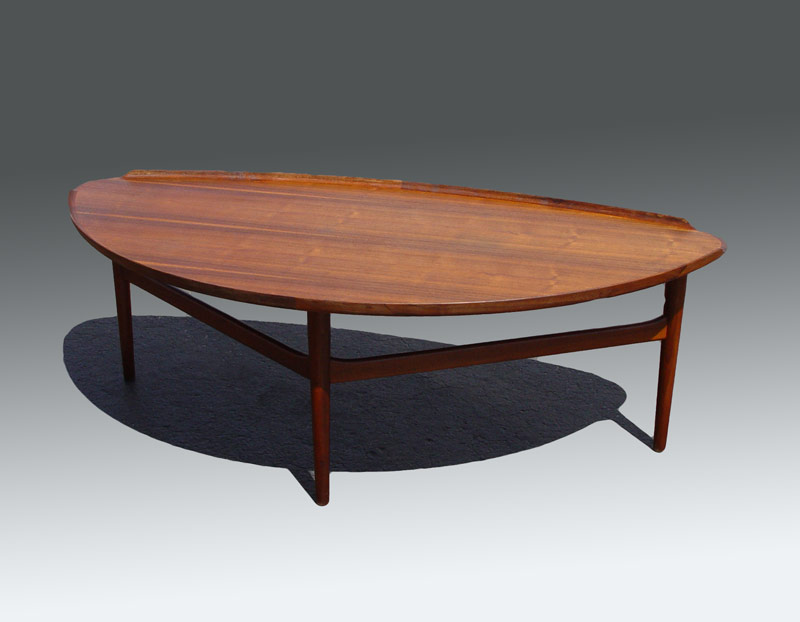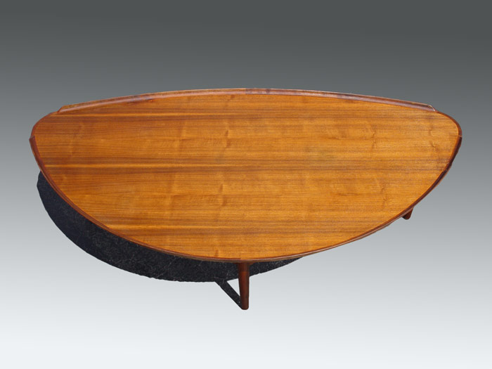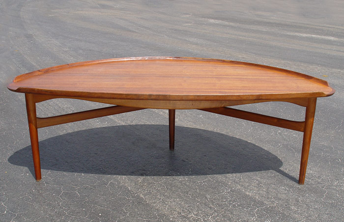FINN JUHL / BAKER MID CENTURY COFFEE TABLE: Curved three sided form with curved lip, on three legs, two joined by a stretcher. Baker metal label. 22 1/2'' tall x 64'' x 31 1/4''.