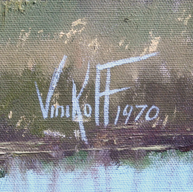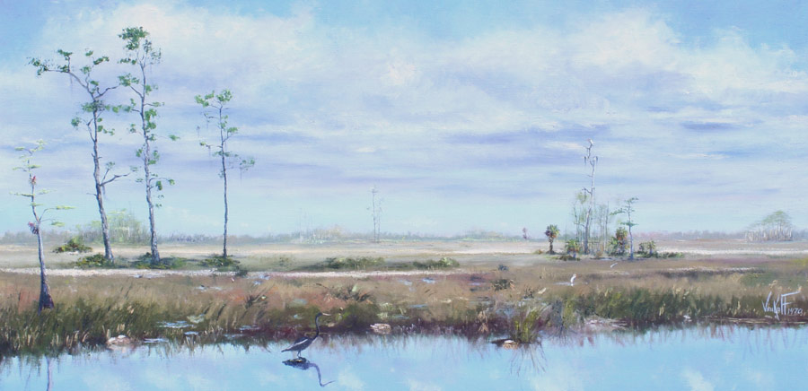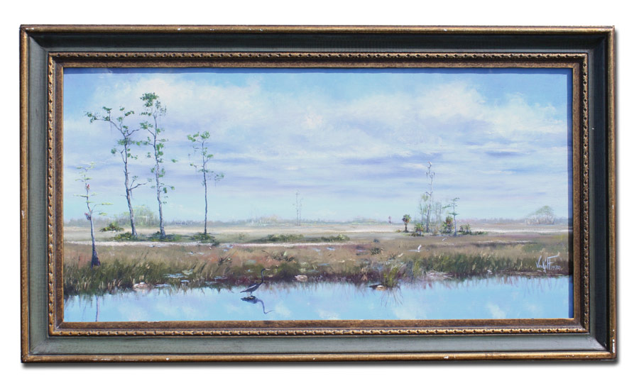 VINIKOFF, Sam, (American, 1919-): Florida Everglades Landscape with Egrets, OIL/Canvas, 24'' x 48'', signed and dated 1970, signed verso, encased in a heavy, painted and gilded gesso frame with minor wear, 32'' x 55''. Known as ''The Everglades Painter'', Vinikoff was an apprentice to Beanie Backus, the artist said to have inspired the Florida Highwaymen. Vinikoff also painted the original poster to commemorate the 19th Annual In The Park With Art, Palmetto Bay, at the age of 80 years old.