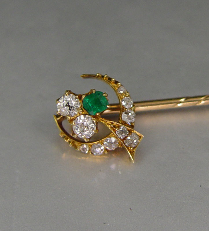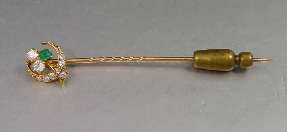 ANTIQUE 18K DIAMOND & EMERALD STICK PIN: Clover motif 18K rose gold stick pin contains ten old European and old mine cut diamonds. Weight: .25 Ct. Approx. The diamonds average SI in clarity and I-J in color. One emerald cut emerald. Weight: .10 Ct. Approx. The diamonds and emerald are prong set. Non gold clutch. Weight: 2.3 grams.