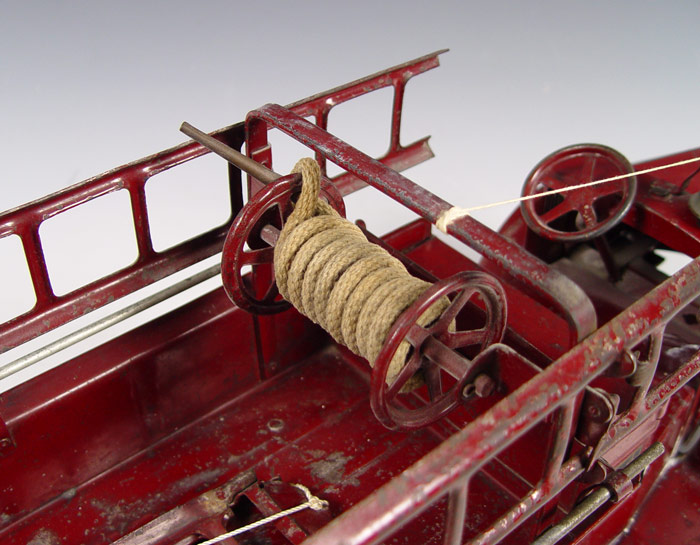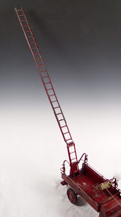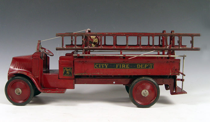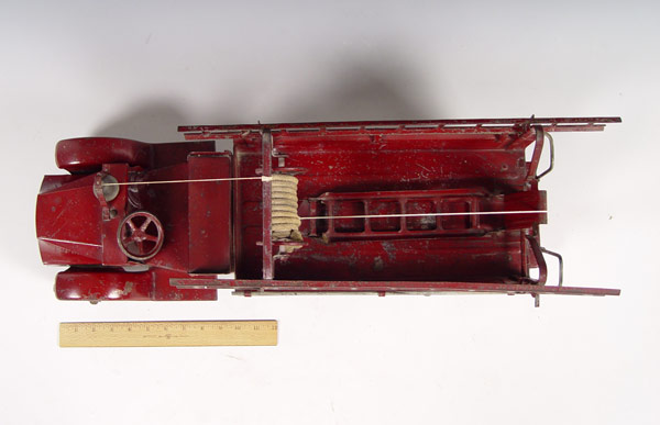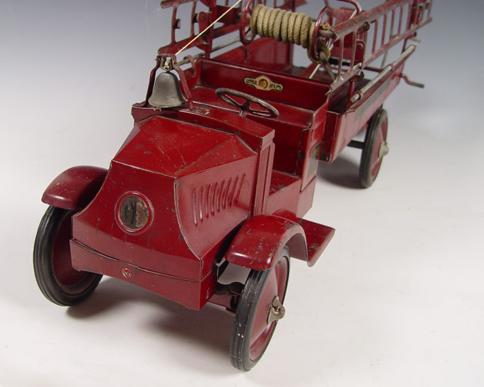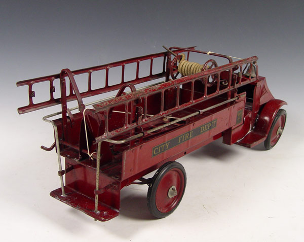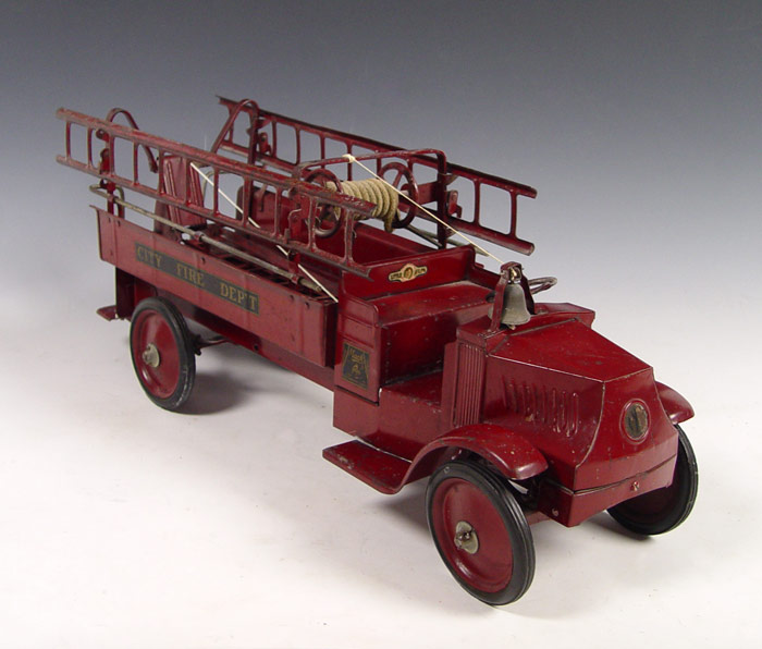 STEELCRAFT PRESSED STEEL MACK FIRE TRUCK: Circa 1920's Steelcraft ''Little Jim'' for J.C. Penney Mack J. City Fire Department truck in original condition with original labels. Complete with side ladders and bell. Measures 10 3/4'' h. x 26'' x 9''.