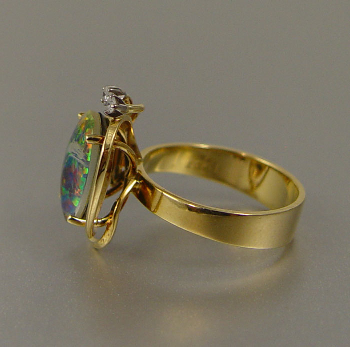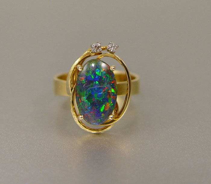 18K OPAL TRIPLET RING: 18K yellow gold ring contains one 12.00 x 8.00 mm opal triplet (damaged) and two round single cut diamonds. Weight: .04 Ct. Rated VS in clarity and H-I in color. The opal and diamonds are prong set. Weight: 5.4 grams. Size: 7.
