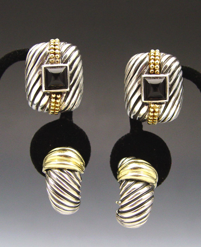 2 PAIR EARRINGS INCLUDE DAVID YURMAN: 1) 14K yellow gold and sterling lobed design, signed D. Yurman, 1''l., clip closure. 2) Yurman style 18K and sterling Yurman style earrings, 1''l., clip closure. Approx. 1.18 oz.