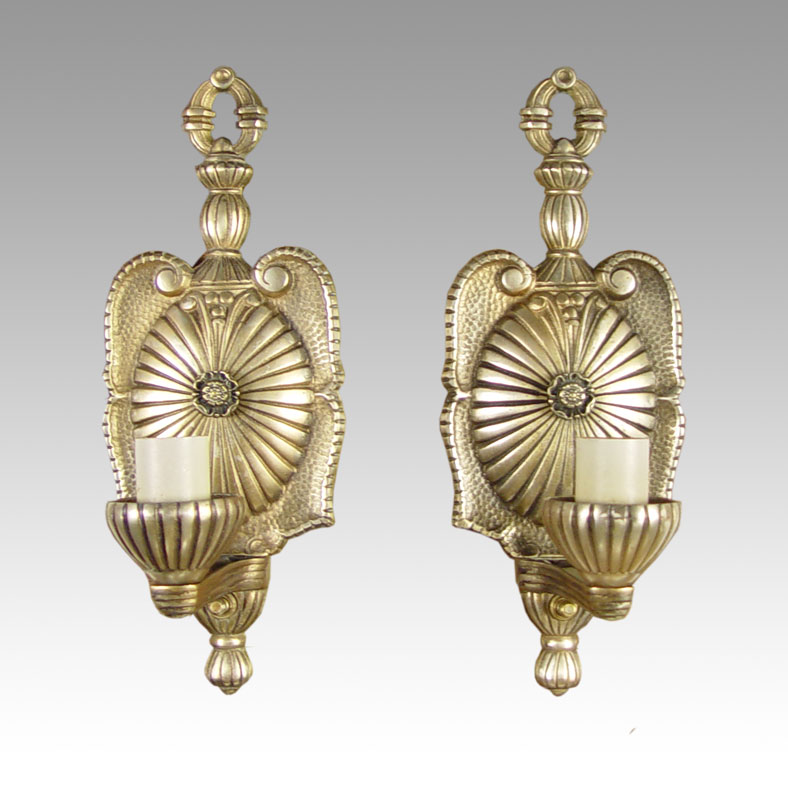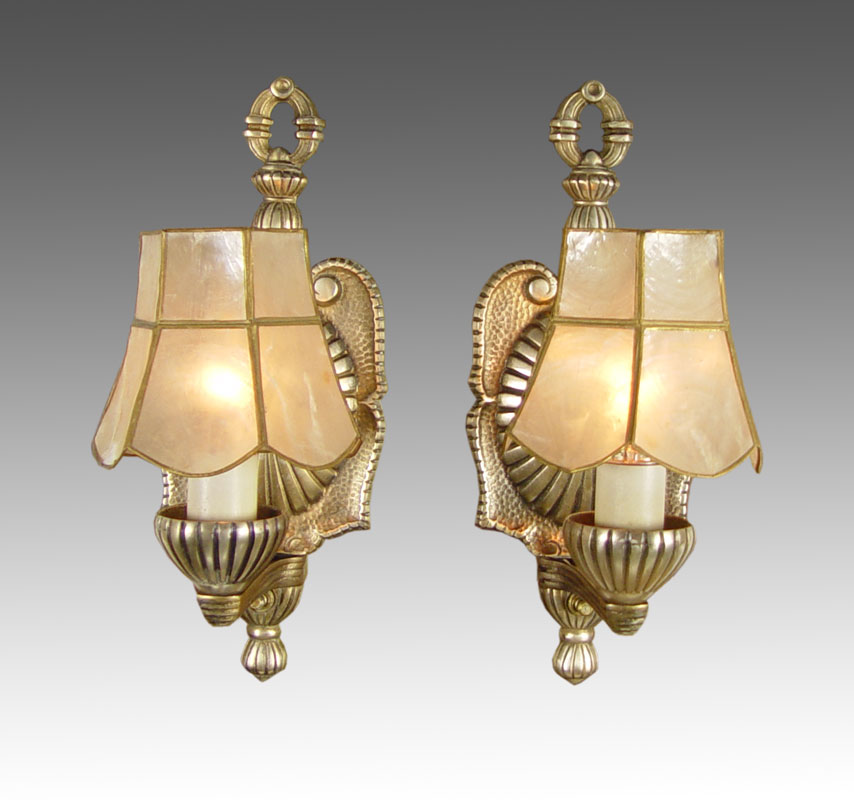 PAIR VINTAGE MOE BROTHERS WALL SCONCE LAMPS: Electric wall mount, single light lamps. Signed Moe Brothers Mfg. Milwaukee G-101. The Moe Brothers were cofounders of Moe-Bridges, and left the company in 1927 when they formed their own company until 1948. Rewired for safety. 11 3/4'' tall, extends 6 1/2'' from the wall.