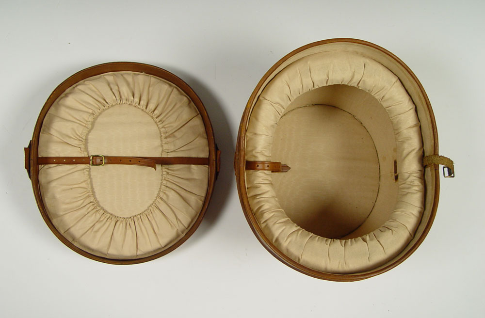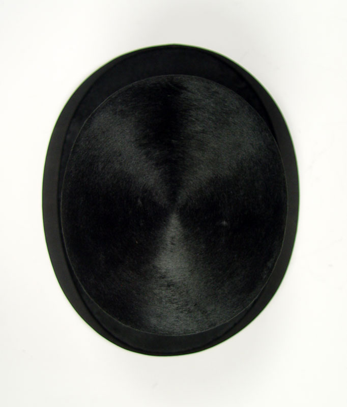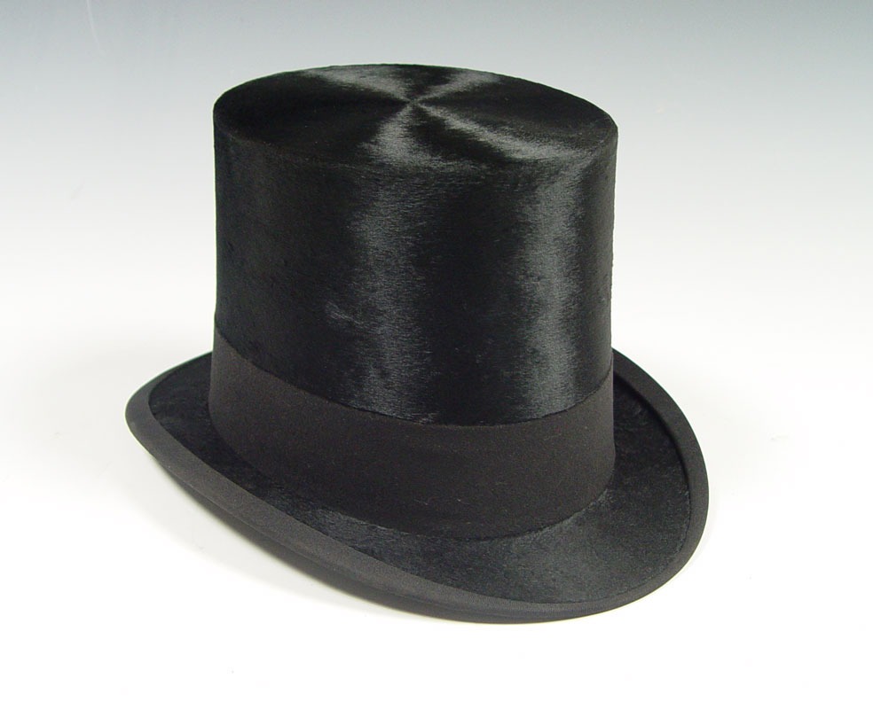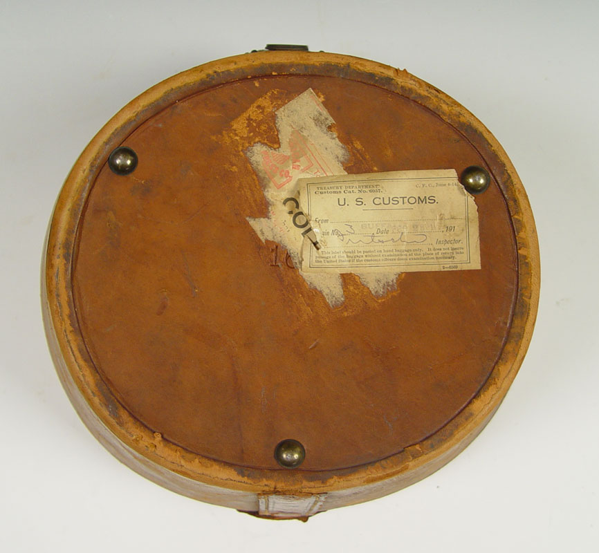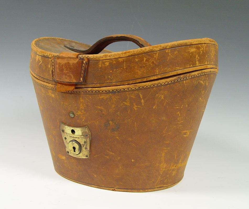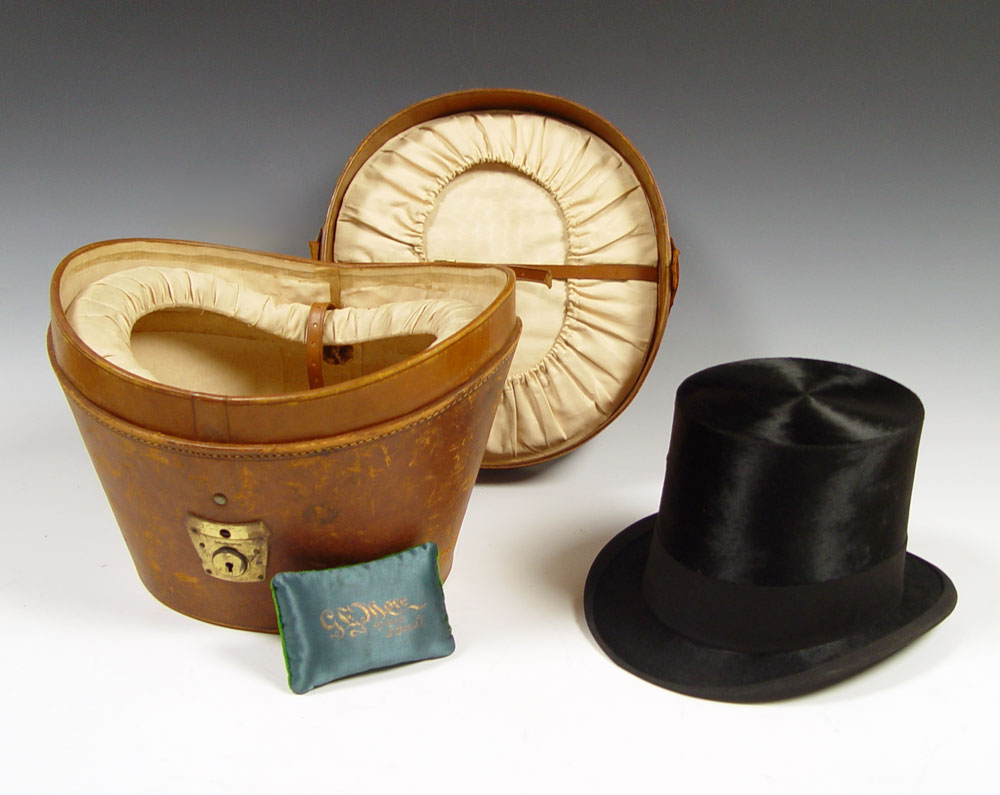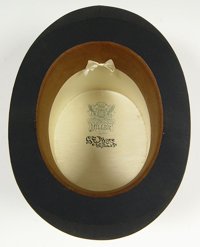 BEAVER SKIN TOP HAT AND ORIGINAL LEATHER BOX: The hat with a Miller New York and GE More Buffalo New York label. The hat is in extremely good condition. The box is scuffed and has a customs label dated November 21 191?. The box is approx. 9 1/2''h. x 13'' x 12''.