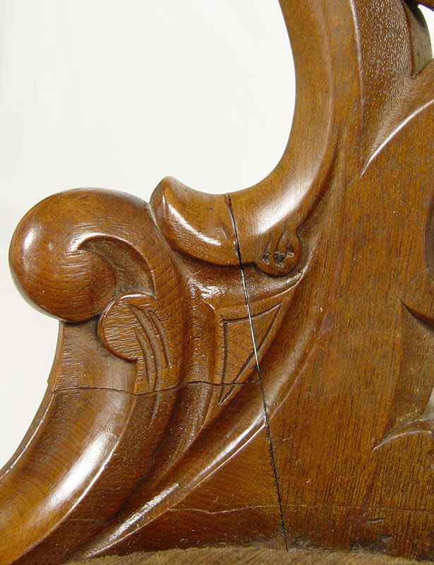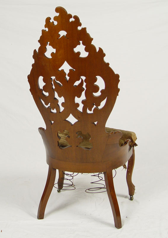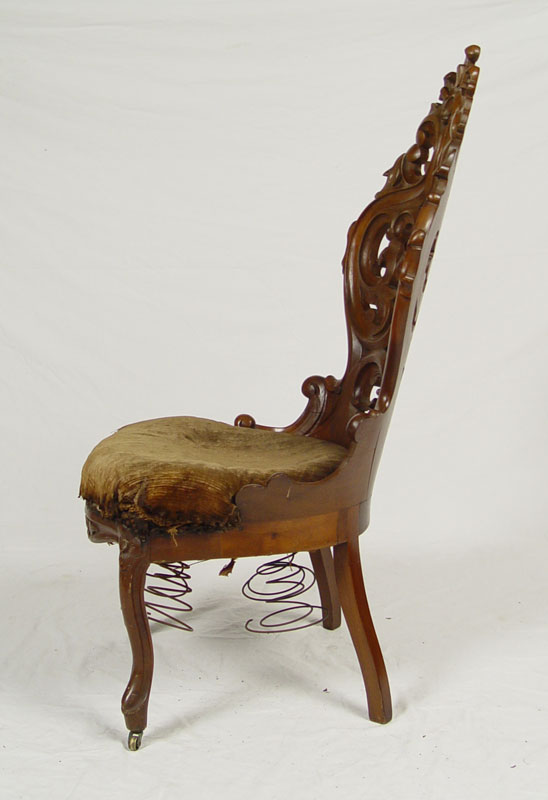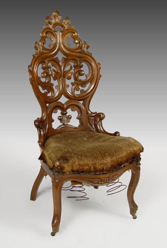BELTER QUALITY ROCAILLE CARVED CHAIR: Pierce carved back. Note springs will need to be tightened. 40 1/2''h. x 19'' x 19''.