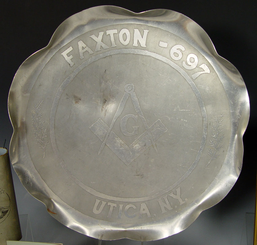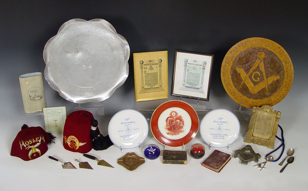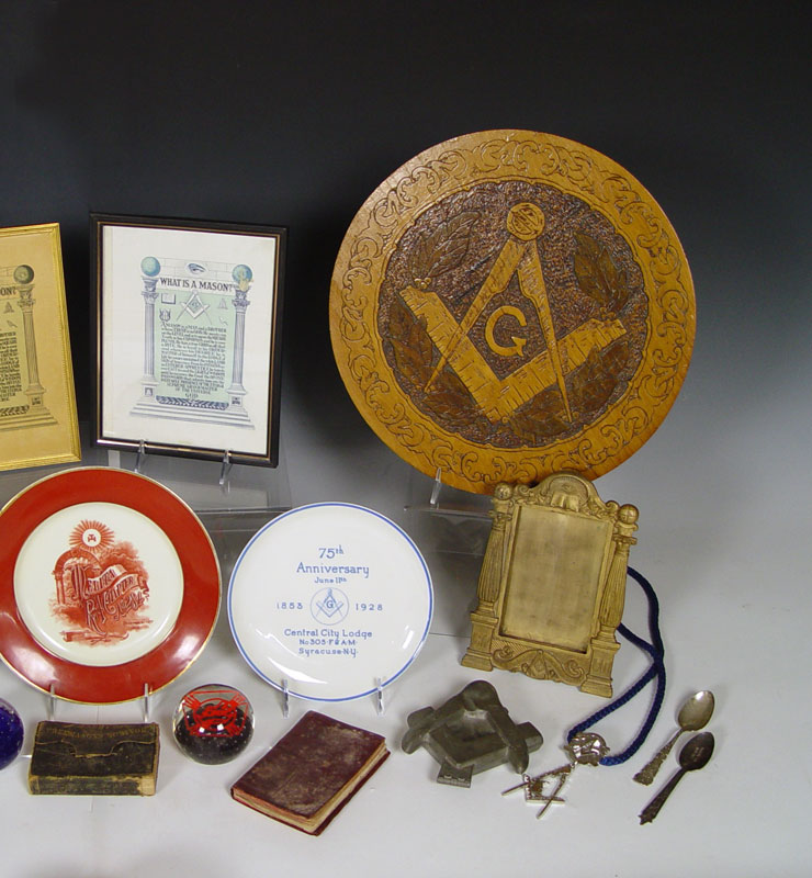 MASONIC MEMORABILIA COLLECTION: To include 1) Carved plaque with square & compass, 14 1/2'' dia.. 2) Masonic chocolate mold, 5 1/2'' x 5 1/4''. 3) Aluminum charger Faxton 697, Utica New York, note dings, 17 3/4'' dia. 4) Cast metal ashtray, 5 1/4'' dia. 5) Pair paperweights, compass and square design note flaws 2 3/4'', Knights Templar design 2 3/4''. 6) Mystic Tie No. 123 1872-1907 cast metal frame, note tape repair to back, 8 3/4'' x 6 1/8''. 7) 3 books, Macoys Freemason's Monitor 1864, coded King David and his Followers 1905-1908 by Gravitt, By Laws of Central City Lodge No. 305 pamphlet, note condition on all. 8) Modern necklace with rope cord, Masonic emblems and man in the moon design. 9) 3 trowels, one missing handle. 2 Central City No. 305. 10) 2 spoons, first is Wallace sterling, second is silverplate with Fayette #69 1827-1975 engraved. 11) 3 plates, 2 are 75th Anniversary Central City Lodge 305, other is Melita Chapter No. 284, dated 1908. Collection is sol with 2 Shriners fez as well, one in original box.
