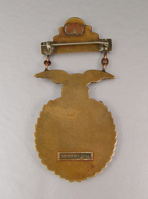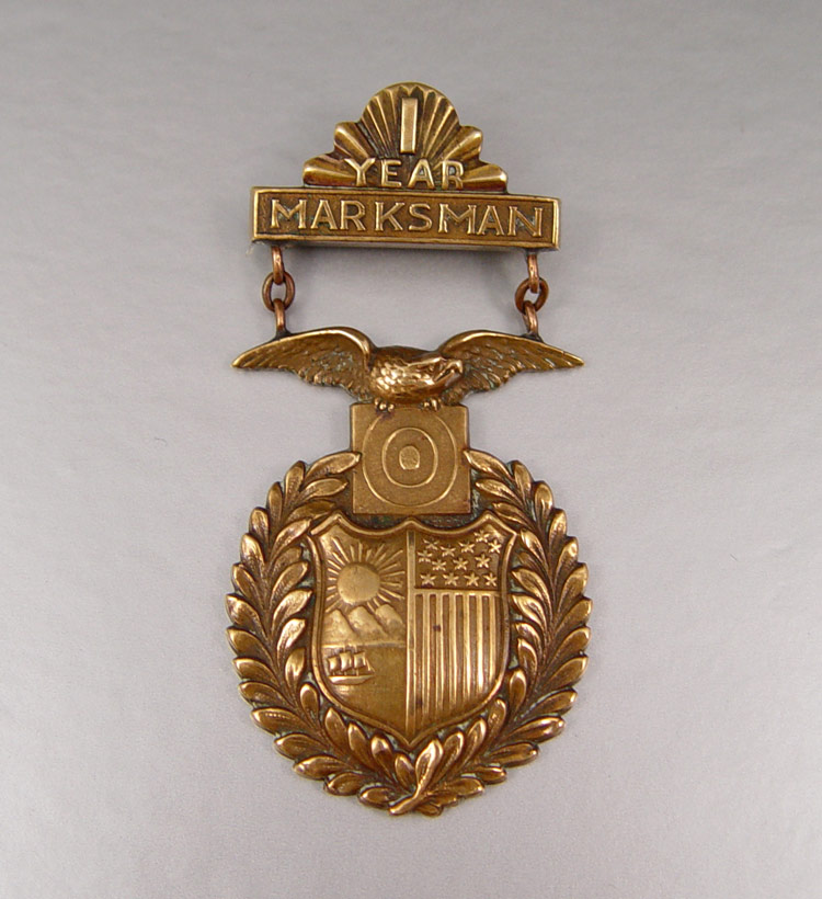TIFFANY & CO. BRONZE 1 YEAR MARKSMAN MEDAL: Turn of the century pinback medal 1 year marksman, well marked Tiffany & Co.. 2 1/2'' h.