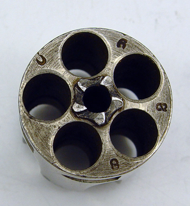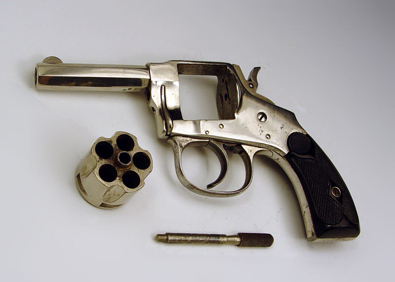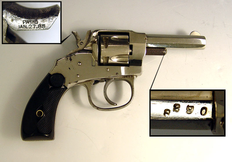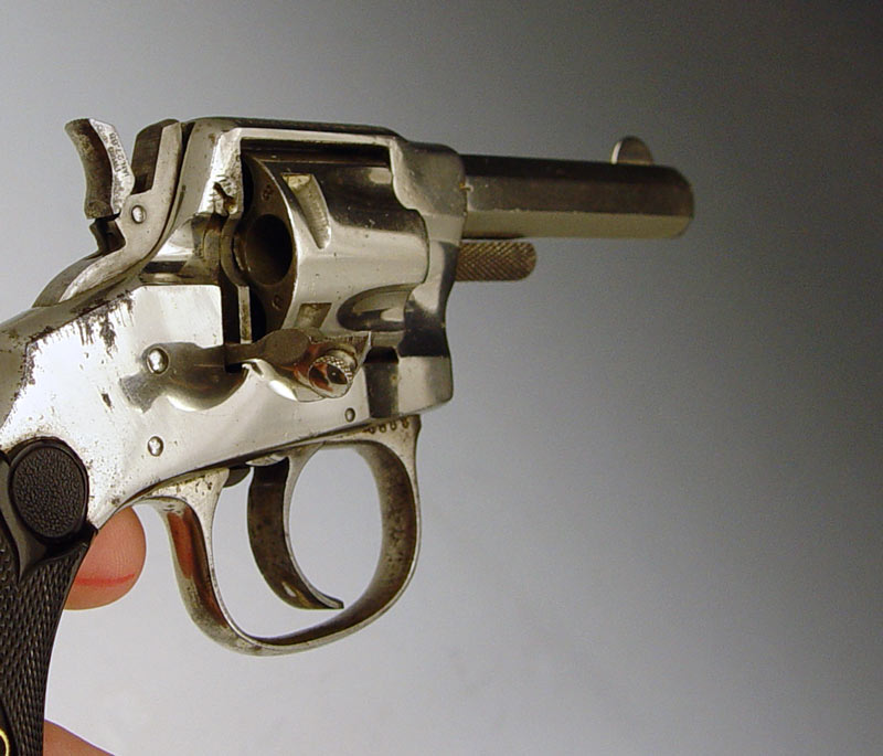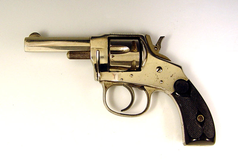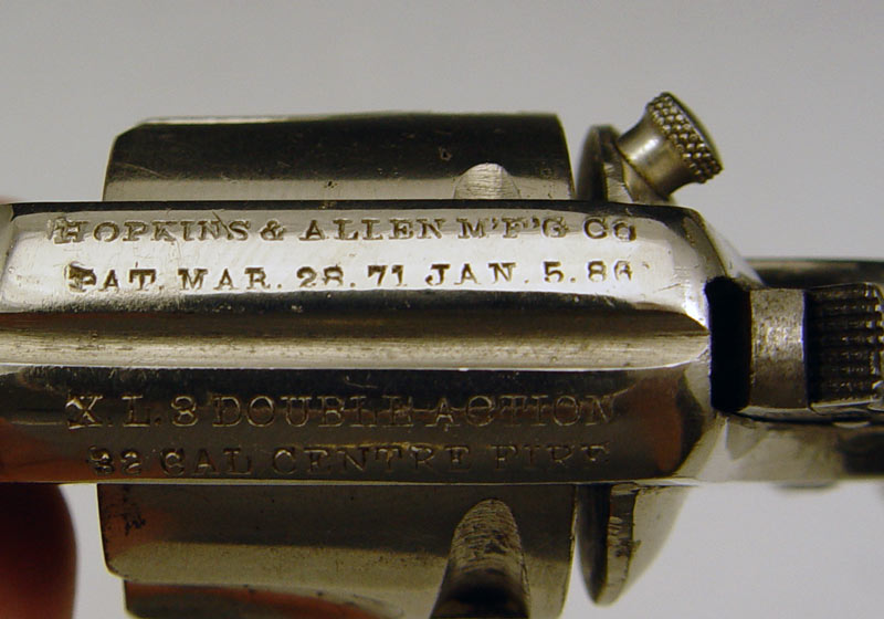 HOPKINS & ALLEN DOUBLE ACTION XL 8 SERIES PISTOL: Circa late 1880's, nickel finish with hard rubber grips and folding hammer. Serial number 8290. Double action works fine, 5 shot cylinder .32 caliber. 2'' barrel, 6'' long overall.