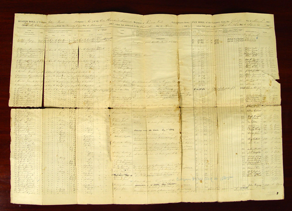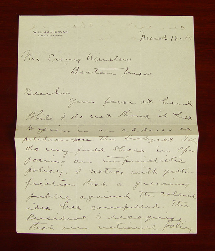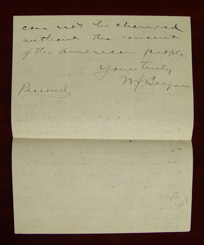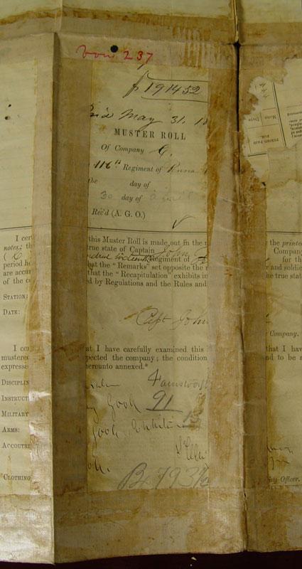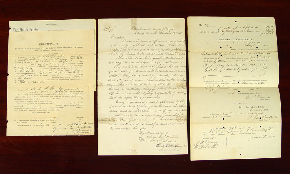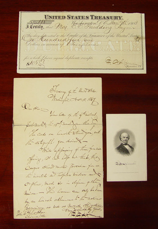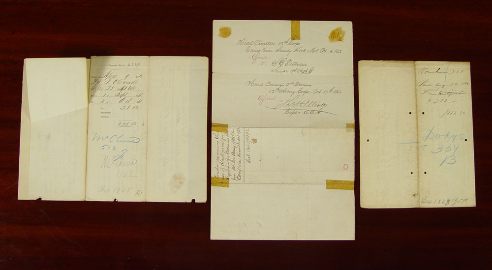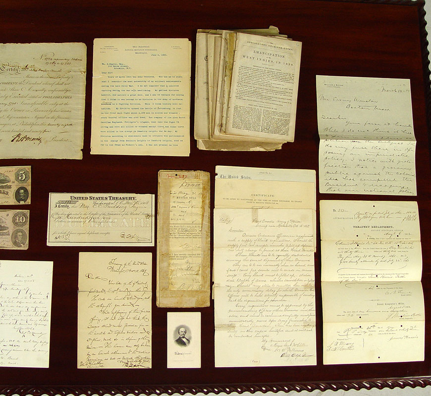 IMPORTANT COLLECTION OF CIVIL WAR EPHEMERA: To include 1863 116th Regiment Company ''C'' Pennsylvania muster roll; Francis Spinner, Treasurer of United States 1864 signed letter; Army of Potomac circular letter by order of Gen. McClellan signed by Alpheus S. Williams, Samuel E E. Pittman and Thomas Elliot; 1863 25th regiment New York Certificate of Discharge by order of Gen. McClellan; 1862 payroll appropriation to Edmund Harris' 15th Indiana father after Harris was killed in action; 3 letters home from Civil War soldiers, one from hospital; 1863 Treasury receipt to Major E. E. Paulding signed by Francis Spinner; $5 and $10 confederate notes; 1868 Sumners Opinion on Impeachment of Andrew Johnson; 1899 signed William Jennings Bryan personal letter on his letterhead. Sold with collection are 12 assorted pamphlets and printed speeches include 1838 Anti Slaver Examiner article on Emancipation in the West Indies; 1794 District of City of New York Port account; 1795 Stock certificate from the North American Land Company; Herbert Humphrey signed letter as Vice President dated 1968.