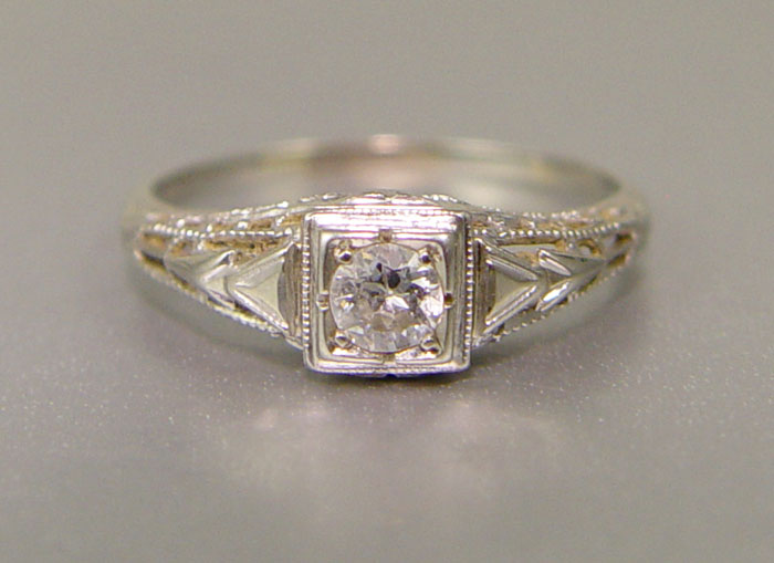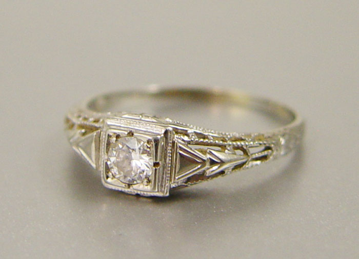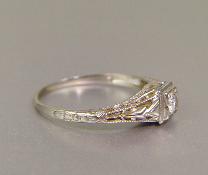 VINTAGE 18K WHITE GOLD FILIGREE DIAMOND RING: 18K filigree ring contains one round full cut diamond. Weight: .15 Ct. Approx. Rated VS in clarity and G-H in color. The diamond is prong set. Weight: 2.0 grams. Size: 8.5