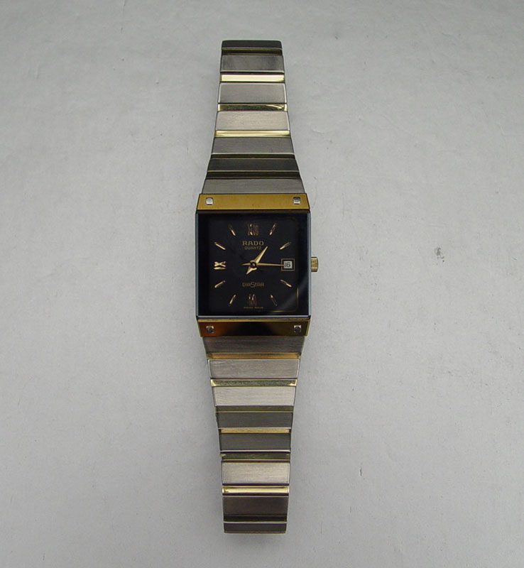 RADO DIASTAR LADIES WRISTWATCH: 18K yellow gold and stainless. The dial features date window on black dial. High quality Swiss quartz movement. Sapphire crystal with gold highlights. Double deployment buckle.